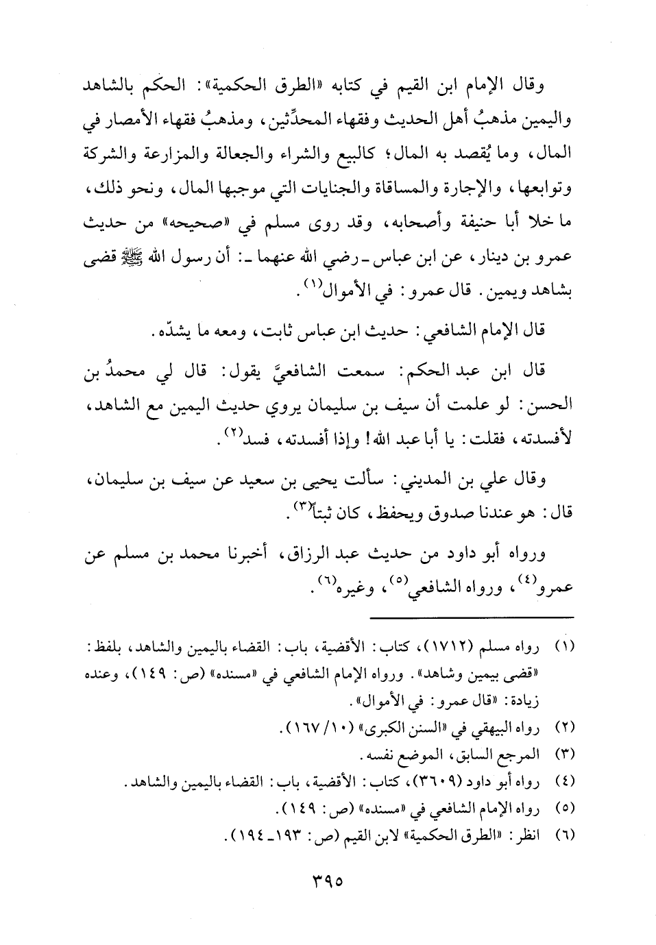 وقال الإمام ابن القيم في كتابه "الطرق الحكمية": الحكم بالشاهد واليمين مذهبُ أهل الحديث وفقهاء المحدِّثين، ومذهبُ فقهاء الأمصار في المال، وما يُقصد به المال؛ كالبيع والشراء والجعالة والمزارعة والشركة وتوابعها، والإجارة والمساقاة والجنايات التي موجبها المال، ونحو ذلك، ما خلا أبا حنيفة وأصحابه، وقد روى مسلم في "صحيحه" من حديث عمرو بن دينار، عن ابن عباس -رضي الله عنهما-: أن رسول الله - صلى الله عليه وسلم - قضى بشاهد ويمين. قال عمرو: في الأموال (١).