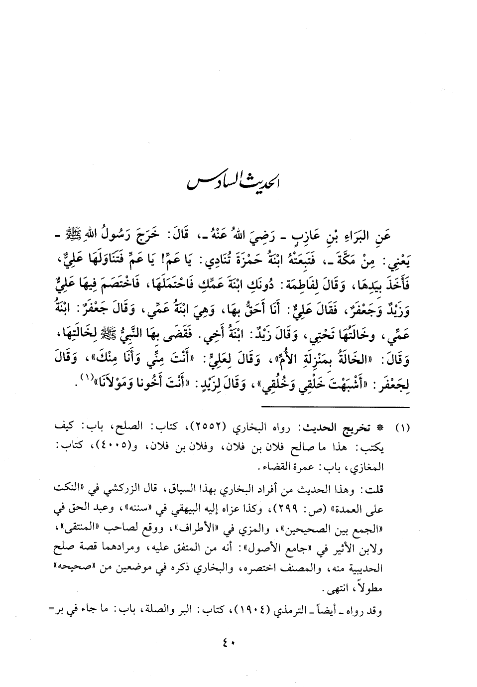 عَنِ البَرَاءِ بْنِ عَازِبٍ - رَضِيَ اللهُ عَنْهُ -، قَالَ: خَرَجَ رَسُولُ اللهِ - صلى الله عليه وسلم -يَعْنِي: مِنْ مَكَّةَ-، فَتَبِعَتْهُ ابْنهُ حَمْزَةَ تُنَادِي: يَا عَمِّ! يَا عَمِّ فَتنَاوَلَهَا عَلِيٌّ، فَأَخَذَ بِيَدِهَا، وَقَالَ لفَاطِمَة: دُونَكِ ابْنهَ عَمِّكِ فَاحْتَمَلَهَا، فَاخْتَصَمَ فِيهَا عَلِيُّ وَزَيْدٌ وَجَعْفَرٌ، فَقَالَ عَلِيُّ: أَنَا أَحَقُّ بهَا، وَهِيَ ابْنهُ عَمِّي، وَقَالَ جَعْفَرٌ: ابْنَةُ عَمِّي، وخَالَتُهَا تَحْتِي، وَقَالَ زَيْدٌ: ابنهُ أَخِي. فَقَضَى بهَا النَّبِيُّ - صلى الله عليه وسلم - لخَالَتِهَا، وَقَالَ: "الخَالَةُ بمَنْزِلَةِ الأُمِّ"، وَقَالَ لِعَلِيٍّ: "أَنْتَ مِنِّي وَأَنَا مِنْكَ"، وَقَالَ لِجَعْفَر: "أَشْبَهْتَ خَلْقِي وَخُلُقِي"، وَقَالَ لِزَيْدٍ: "أَنْتَ أَخُونا وَمَوْلاَنَا" (١).