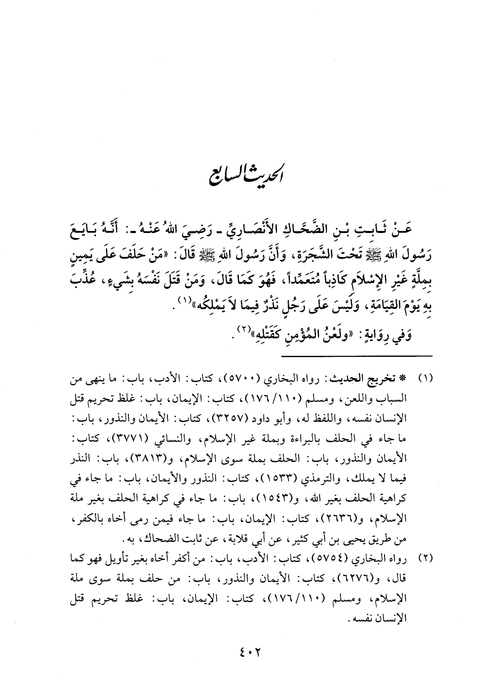 عَنْ ثَابتِ بْنِ الضَّحَّاكِ الأَنْصَارِيِّ - رضي الله عنه -: أَنَّهُ بَايَعَ رَسُولَ اللهِ - صلى الله عليه وسلم - تَحْتَ الشَّجَرَةِ، وَأَنَّ رَسُولَ اللهِ - صلى الله عليه وسلم - قَالَ: "مَنْ حَلَفَ عَلَى يَمِينٍ بِمِلَّةٍ غَيْرِ الإِسلَامِ كَاذِبًا مُتَعَمِّدًا، فَهُوَ كَمَا قَالَ، وَمَنْ قَتَلَ نَفْسَهُ بشِيءِ، عُذِّبَ بِهِ يَوْمَ القِيَامَةِ، وَليْسَ عَلَى رَجُلٍ نَذْرٌ فِيمَا لَا يَمْلِكُه" (١).