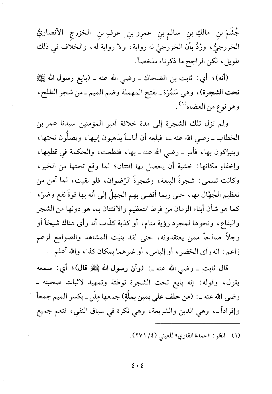 ولم تزل تلك الشجرة إلى مدة خلافة أمير المؤمنين سيدنا عمر بن الخطاب - رضي الله عنه -، فبلغه أن أناسًا يذهبون إليها، ويصلُّون تحتها، ويتبرَّكون بها، فأمر - رضي الله عنه - بها، فقطعت، والحكمة في قطعِها، وإخفاءِ مكانها: خشية أن يحصل بها افتتان؛ لما وقع تحتها من الخير، وكانت تسمى: شجرةَ البيعة، وشجرةَ الرّضوان، فلو بقيت، لما أمن من تعظيم الجُهَّال لها، حتى ربما أفضى بهم الجهلُ إلى أنه بها قوةَ نفع وضرّ، كما هو شأن أبناء الزمان من فرط التعظيم والافتتان بما هو دونها من الشجر والبقاع، ونحوها لمجرد رؤية منام، أو كذبة كذّاب أنه رأى هناك شيخًا أو رجلًا صالحًا ممن يعتقدونه، حتى لقد بنيت المشاهد والصوامع لزعم زاعم: أنه رأى الخضر، أو إلياس، أو غيرهما بمكان كذا، والله أعلم.