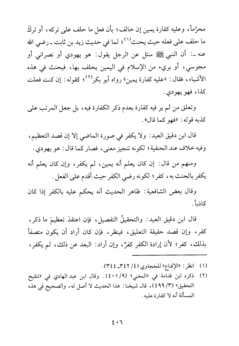 محرَّمًا، وعليه كفارة يمين إن خالف؛ بأن فعل ما حلف على تركه، أو تركَ ما حلف على فعله حيث يحنث (١)؛ لما في حديث زيد بن ثابت - رضي الله عنه -: أن النبي - صلى الله عليه وسلم - سئل عن الرجل يقول: هو يهودي أو نصراني أو مجوسي، أو بريء من الإسلام في اليمين يحلف بها، فيحنث في هذه الأشياء، فقال: "عليه كفارة يمين" رواه أبو بكر (٢)؛ كقوله: إن كنت فعلت كذا، فهو يهودي.