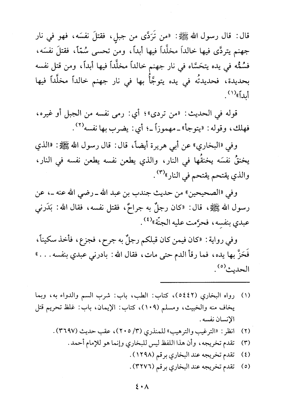 وفي "الصحيحين" من حديث جندب بن عبد الله - رضي الله عنه -، عن رسول الله - صلى الله عليه وسلم -، قال: "كان رجلٌ به جراحٌ، فقتل نفسه، فقال الله: بَدَرني عبدي بنفسِه، فحرَّمت عليه الجنّة" (٤).