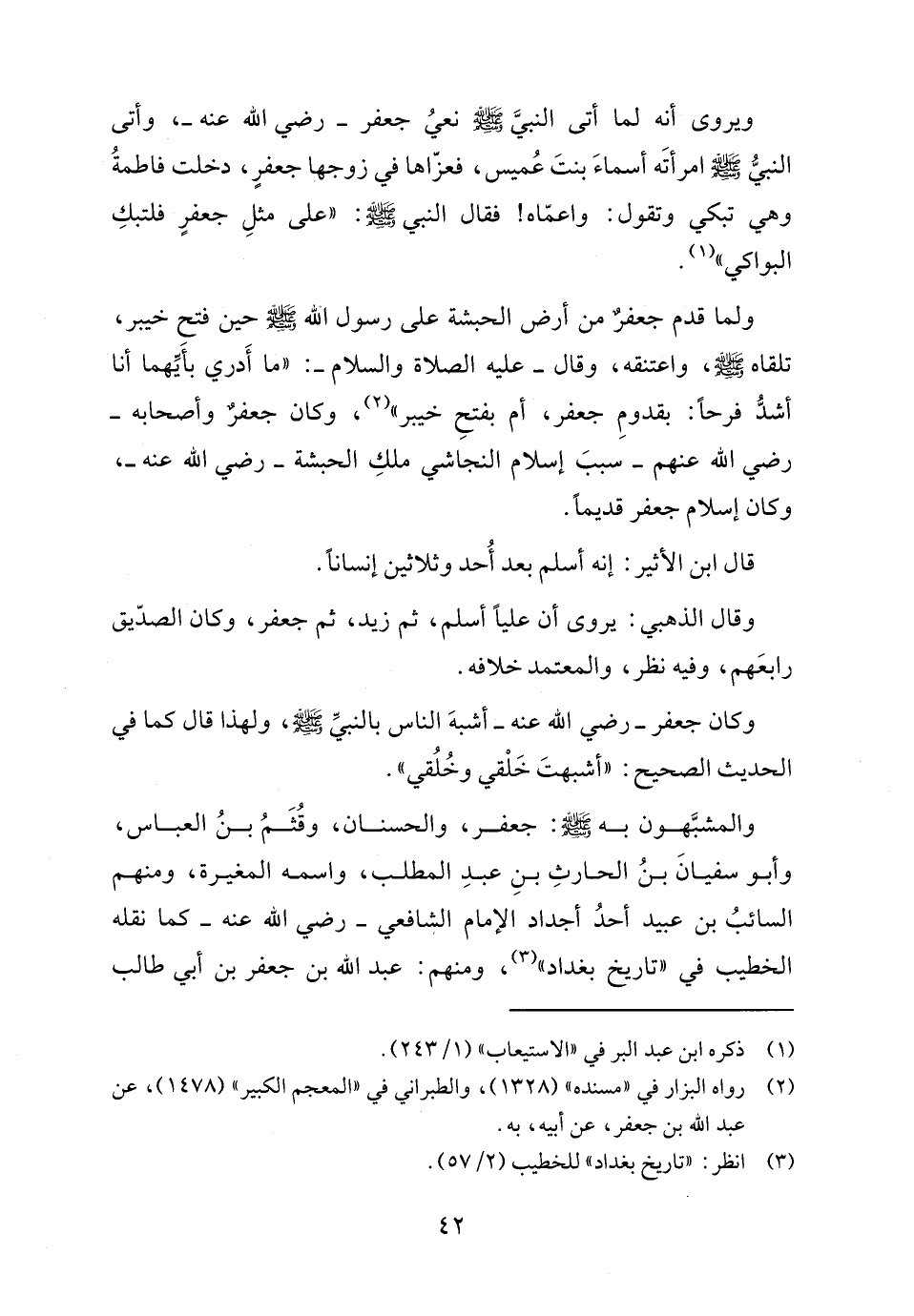 وكان جعفر - رضي الله عنه - أشبهَ الناس بالنبيِّ - صلى الله عليه وسلم -، ولهذا قال كما في الحديث الصحيح: "أشبهتَ خَلْقي وخُلُقي".