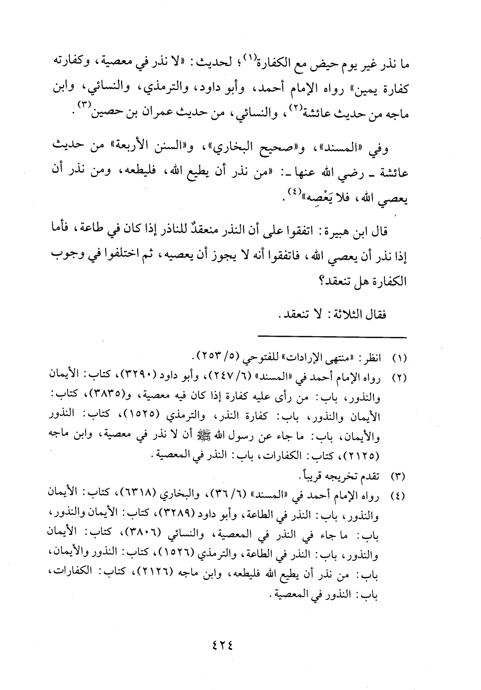 (٢) رواه الإمام أحمد في "المسند" (٦/ ٢٤٧)، وأبو داود (٣٢٩٠)، كتاب: الأيمان والنذور، باب: من رأى عليه كفارة إذا كان فيه معصية، و (٣٨٣٥)، كتاب: الأيمان والنذور، باب: كفارة النذر، والترمذي (١٥٢٥)، كتاب: النذور والأيمان، باب: ما جاء عن رسول الله - صلى الله عليه وسلم - أن لا نذر في معصية، وابن ماجه (٢١٢٥)، كتاب: الكفارات، باب: النذر في المعصية.