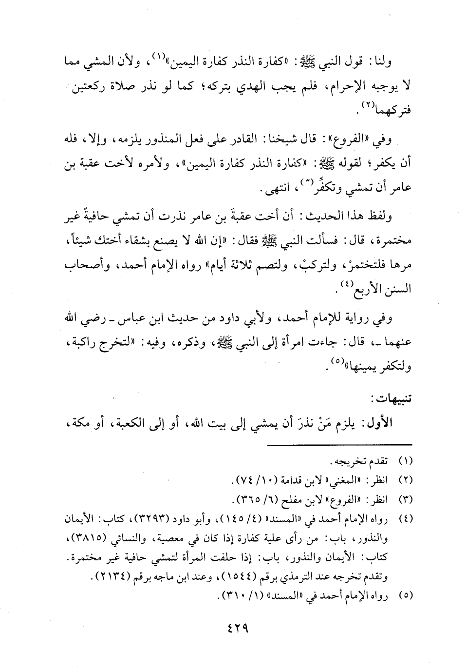 (٤) رواه الإمام أحمد في "المسند" (٤/ ١٤٥)، وأبو داود (٣٢٩٣)، كتاب: الأيمان والنذور، باب: من رأى علية كفارة إذا كان في معصية، والنسائي (٣٨١٥)، كتاب: الأيمان والنذور، باب: إذا حلفت المرأة لتمشي حافية غير مختمرة. وتقدم تخرجه عند الترمذي برقم (١٥٤٤)، وعند ابن ماجه برقم (٢١٣٤).