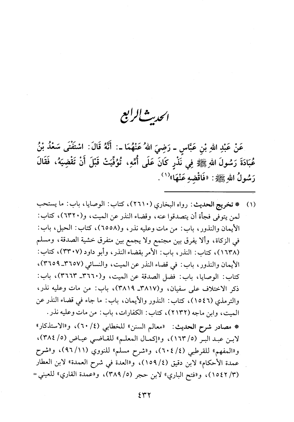 عَنْ عَبْدِ اللهِ بْنِ عَباسٍ -رَضِيَ اللهُ عَنْهُمَا-: أَنَّهُ قَالَ: اسْتَفْتَى سَعْدُ بْنُ عُبَادَةَ رَسُولَ اللهِ - صلى الله عليه وسلم - فِي نَذْرٍ كَانَ عَلَى أُمِّهِ، تُوُفِّيَتْ قَبْلَ أَنْ تَقْضِيَهُ، فَقَالَ رَسُولُ اللهِ - صلى الله عليه وسلم -: "فَاقْضِهِ عَنْهَا" (١).