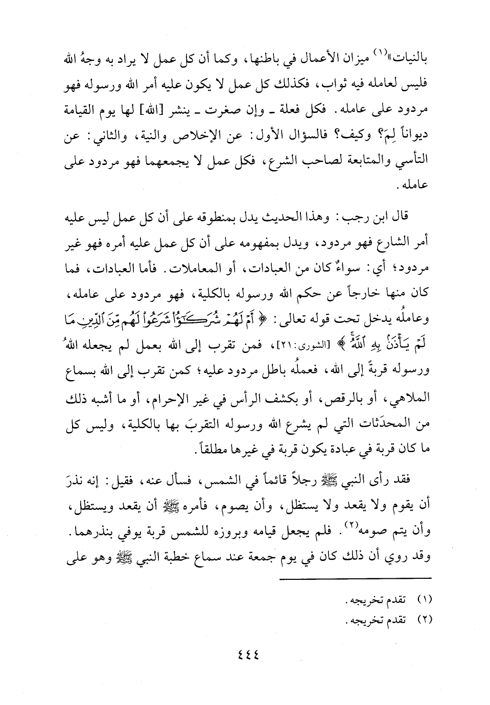 قال ابن رجب: وهذا الحديث يدل بمنطوقه على أن كل عمل ليس عليه أمر الشارع فهو مردود، ويدل بمفهومه على أن كل عمل عليه أمره فهو غير مردود؛ أي: سواءٌ كان من العبادات، أو المعاملات. فأما العبادات، فما كان منها خارجًا عن حكم الله ورسوله بالكلية، فهو مردود على عامله، وعاملُه يدخل تحت قوله تعالى: {أَمْ لَهُمْ شُرَكَاءُ شَرَعُوا لَهُمْ مِنَ الدِّينِ مَا لَمْ يَأْذَنْ بِهِ اللَّهُ} [الشورى: ٢١]، فمن تقرب إلى الله بعمل لم يجعله اللهُ ورسوله قربةً إلى الله، فعملُه باطل مردود عليه؛ كمن تقرب إلى الله بسماع الملاهي، أو بالرقص، أو بكشف الرأس في غير الإحرام، أو ما أشبه ذلك من المحدَثات التي لم يشرع الله ورسوله التقربَ بها بالكلية، وليس كل ما كان قربة في عبادة يكون قربة في غيرها مطلقًا.