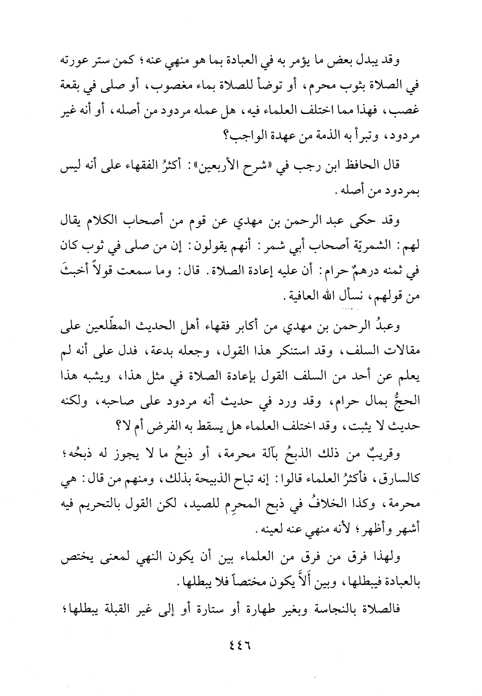 وعبدُ الرحمن بن مهدي من أكابر فقهاء أهل الحديث المطّلعين على مقالات السلف، وقد استنكر هذا القول، وجعله بدعة، فدل على أنه لم يعلم عن أحد من السلف القول بإعادة الصلاة في مثل هذا، ويشبه هذا الحجُّ بمال حرام، وقد ورد في حديث أنه مردود على صاحبه، ولكنه حديث لا يثبت، وقد اختلف العلماء هل يسقط به الفرض أم لا؟