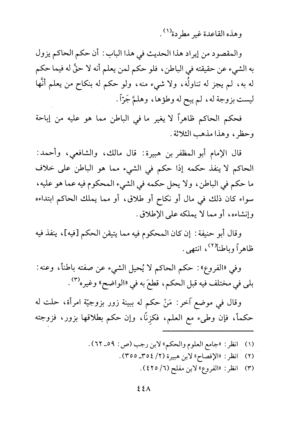 وفي "الفروع": حكم الحاكم لا يُحيل الشيء عن صفته باطنًا، وعنه: بلى في مختلف فيه قبل الحكم، قطعَ به في "الواضح" وغيره (٣).