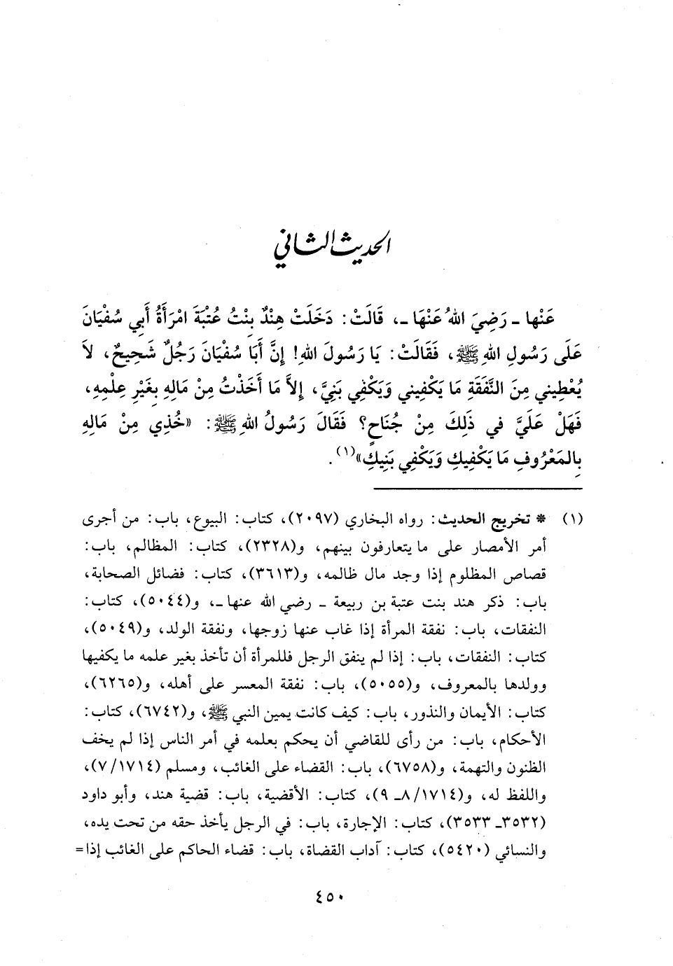 رواه البخاري (٢٠٩٧)، كتاب: البيوع، باب: من أجرى أمر الأمصار على ما يتعارفون بينهم، و (٢٣٢٨)، كتاب: المظالم، باب: قصاص المظلوم إذا وجد مال ظالمه، و (٣٦١٣)، كتاب: فضائل الصحابة، باب: ذكر هند بنت عتبة بن ربيعة -رضي الله عنها-، و (٥٠٤٤)، كتاب: النفقات، باب: نفقة المرأة إذا غاب عنها زوجها، ونفقة الولد، و (٥٠٤٩)، كتاب: النفقات، باب: إذا لم ينفق الرجل فللمرأة أن تأخذ بغير علمه ما يكفيها وولدها بالمعروف، و (٥٠٥٥)، باب: نفقة المعسر على أهله، و (٦٢٦٥)، كتاب: الأيمان والنذور، باب: كيف كانت يمين النبي - صلى الله عليه وسلم -، و (٦٧٤٢)، كتاب: الأحكام، باب: من رأى للقاضي أن يحكم بعلمه في أمر الناس إذا لم يخف الظنون والتهمة، و (٦٧٥٨)، باب: القضاء على الغائب، ومسلم (١٧١٤/ ٧)، واللفظ له، و (١٧١٤/ ٨ - ٩)، كتاب: الأقضية، باب: قضية هند، وأبو داود (٣٥٣٢ - ٣٥٣٣)، كتاب: الإجارة، باب: في الرجل يأخذ حقه من تحت يده، والنسائي (٥٤٢٠)، كتاب: آداب القضاة، باب: قضاء الحاكم على الغائب إذا =