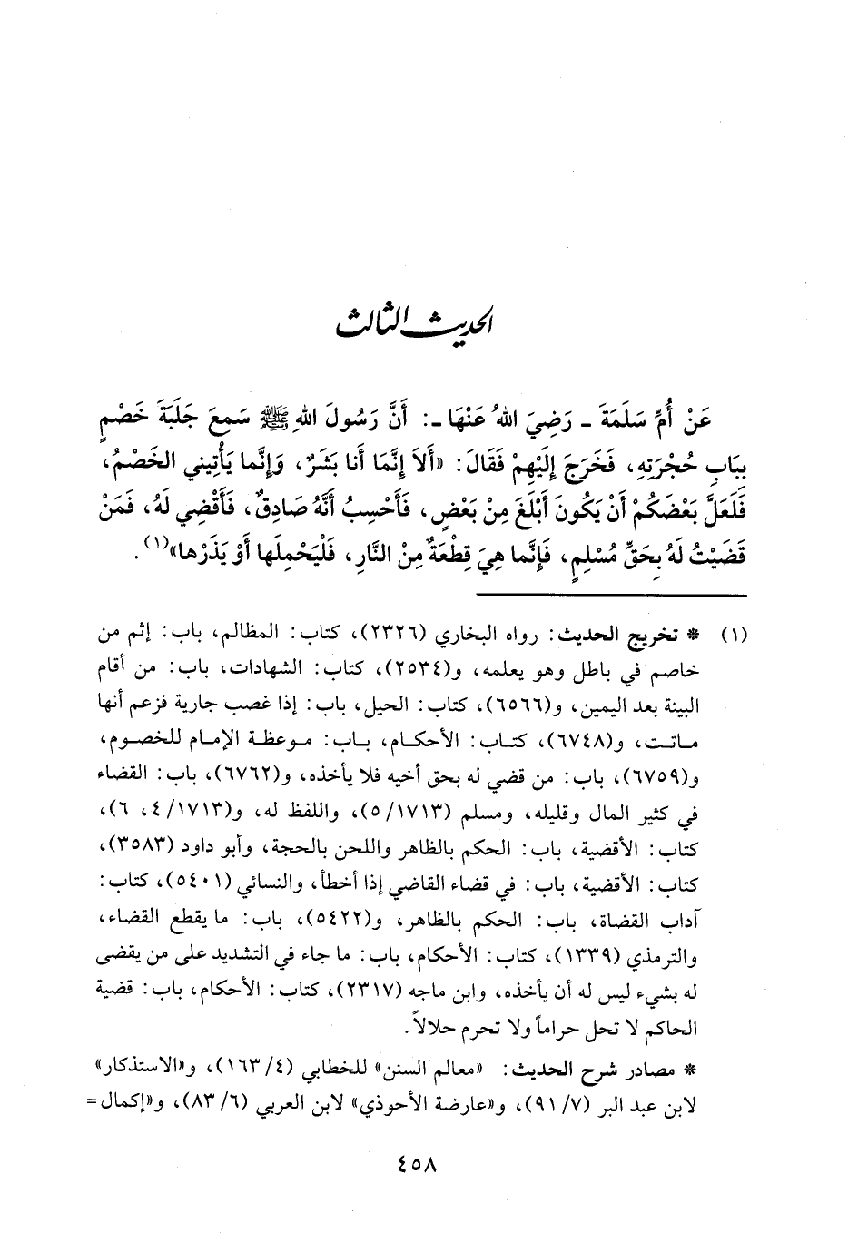 عَنْ أُمِّ سَلَمَةَ -رَضِيَ اللهُ عَنْهَا-: أَنَّ رَسُولَ اللهِ - صلى الله عليه وسلم - سَمِعَ جَلَبَةَ خَصْمٍ ببَابِ حُجْرَتهِ، فَخَرَجَ إلَيْهِمْ فَقَالَ: "أَلَا إِنما أَنا بَشَرٌ، وَإنَّما يَأْتِيني الخَصْمُ، فَلَعَلَّ بَعْضَكُمْ أَنْ يَكُونَ أَبْلَغَ مِنْ بَعْضٍ، فَأَحْسِبُ أَنّهُ صَادِقٌ، فَأقْضِي لَهُ، فَمَنْ قَضَيْتُ لَهُ بِحَقِّ مُسْلِمٍ، فَإنَّما هِيَ قِطْعَةٌ مِنْ النَّارِ، فَلْيَحْمِلَها أَوْ يَذَرْها" (١).