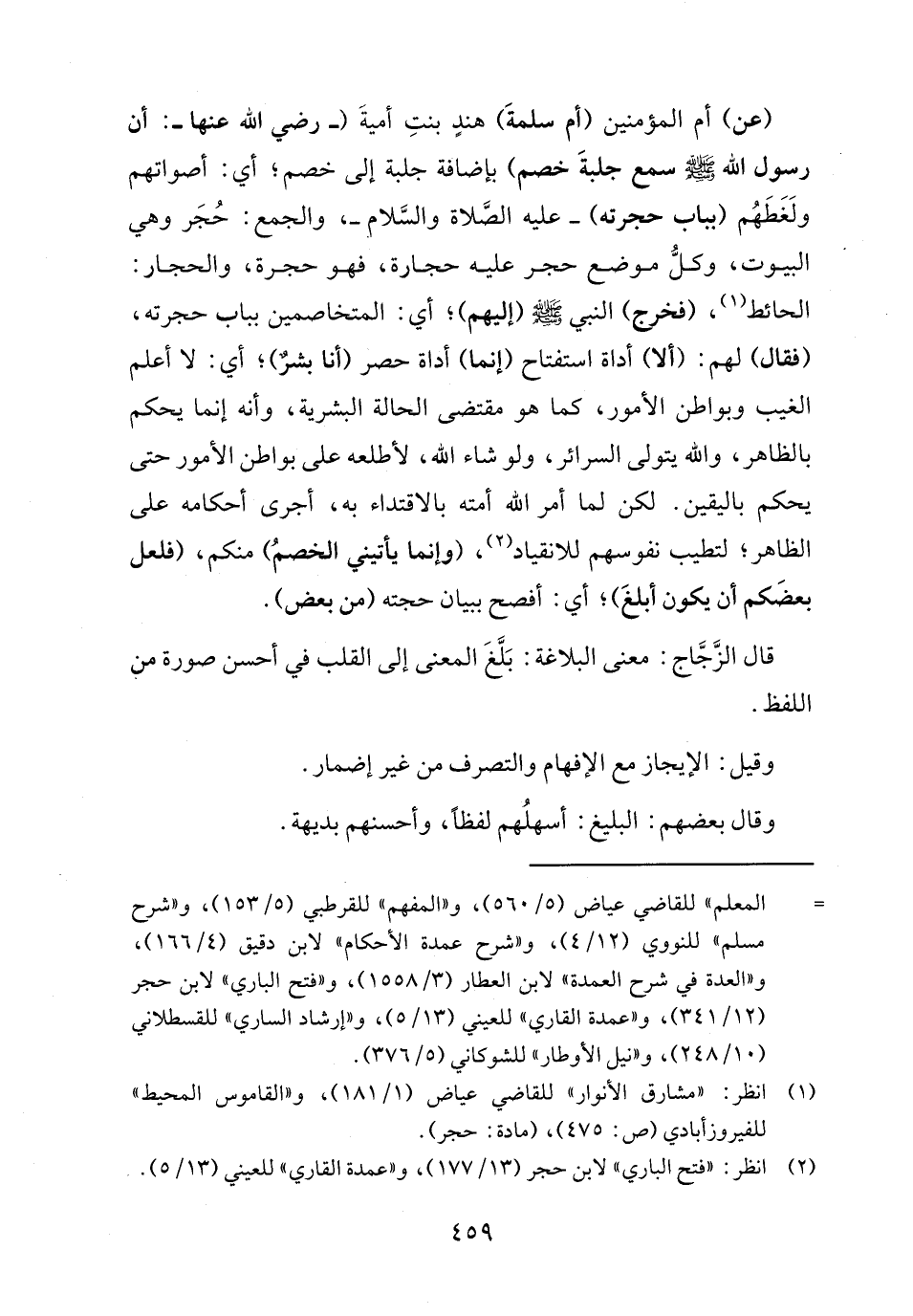 (عن) أم المؤمنين (أم سلمةَ) هندٍ بنتِ أميةَ (-رضي الله عنها-: أن رسول الله - صلى الله عليه وسلم - سمع جلبةَ خصم) بإضافة جلبة إلى خصم؛ أي: أصواتهم ولَغَطَهُم (بباب حجرته) -عليه الصَّلاة والسَّلام-، والجمع: حُجَر وهي البيوت، وكلُّ موضع حجر عليه حجارة، فهو حجرة، والحجار: الحائط (١)، (فخرج) النبي - صلى الله عليه وسلم - (إليهم)؛ أي: المتخاصمين بباب حجرته، (فقال) لهم: (ألا) أداة استفتاح (إنما) أداة حصر (أنا بشرٌ)؛ أي: لا أعلم الغيب وبواطن الأمور، كما هو مقتضى الحالة البشرية، وأنه إنما يحكم بالظاهر، والله يتولى السرائر، ولو شاء الله، لأطلعه على بواطن الأمور حتى يحكم باليقين. لكن لما أمر الله أمته بالاقتداء به، أجرى أحكامه على الظاهر؛ لتطيب نفوسهم للانقياد (٢)، (وإنما يأتيني الخصمُ) منكم، (فلعل بعضَكم أن يكون أبلغَ)؛ أي: أفصح ببيان حجته (من بعض).