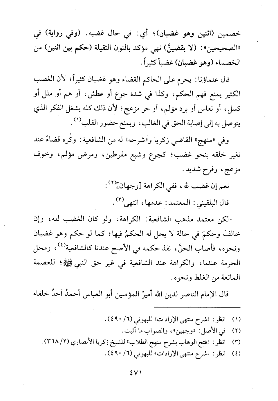 لكن معتمد مذهب الشافعية: الكراهة، ولو كان الغضب لله، وإن خالفَ وحكمَ في حالة لا يحل له الحكمُ فيها؛ كما لو حكم وهو غضبان ونحوه، فأصاب الحقَّ، نفذ حكمه في الأصح عندنا كالشافعية (٤)، ومحل الحرمة عندنا، والكراهة عند الشافعية في غير حق النبي - صلى الله عليه وسلم -؛ للعصمة المانعة من الغلط ونحوه.