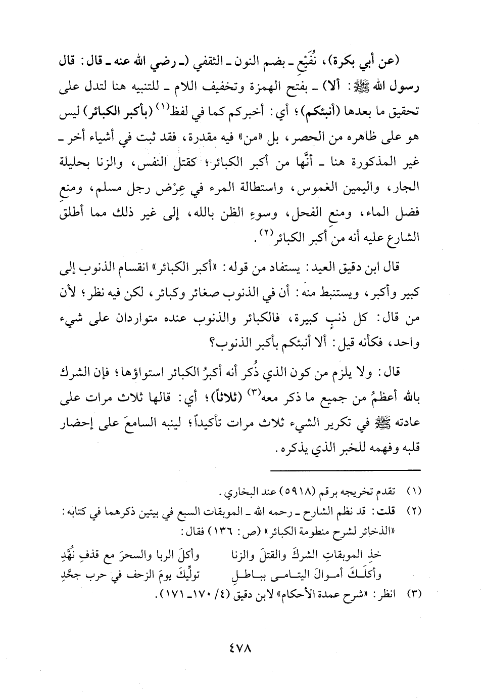 قال ابن دقيق العيد: يستفاد من قوله: "أكبر الكبائر" انقسام الذنوب إلى كبير وأكبر، ويستنبط منه: أن في الذنوب صغائر وكبائر، لكن فيه نظر؛ لأن من قال: كل ذنبٍ كبيرة، فالكبائر والذنوب عنده متواردان على شيء واحد، فكأنه قيل: ألا أنبئكم بأكبر الذنوب؟