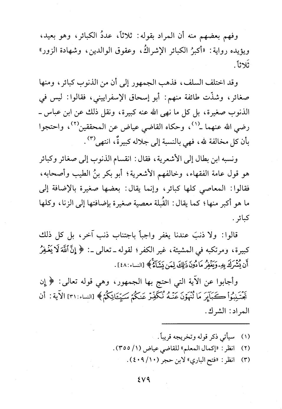 ونسبه ابن بطال إلى الأشعرية، فقال: انقسام الذنوب إلى صغائر وكبائر هو قول عامة الفقهاء، وخالفهم الأشعرية؛ أبو بكر بنُ الطيب وأصحابه، فقالوا: المعاصي كلها كبائر، وإنما يقال: بعضها صغيرة بالإضافة إلى ما هو أكبر منها؛ كما يقال: القُبلة معصية صغيرة بإضافتها إلى الزنا، وكلها كبائر.