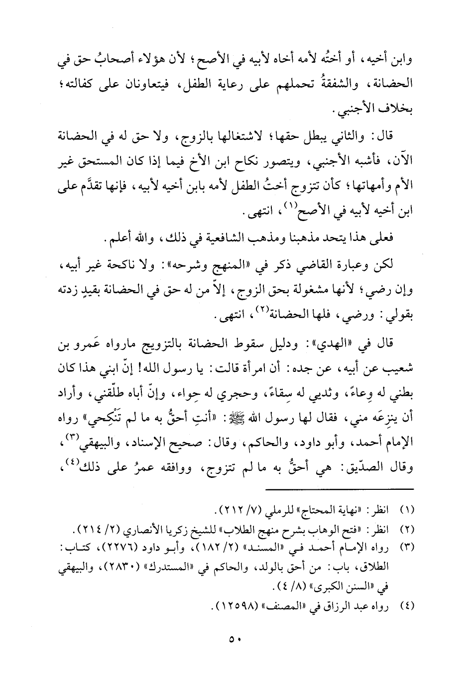 قال في "الهدي": ودليل سقوط الحضانة بالتزويج ما رواه عَمرو بن شعيب عن أبيه، عن جده: أن امرأة قالت: يا رسول الله! إنّ ابني هذا كان بطني له وِعاءً، وثديي له سِقاءً، وحجري له حِواء، وإنّ أباه طلّقني، وأراد أن ينزِعَه مني، فقال لها رسول الله - صلى الله عليه وسلم -: "أنتِ أحقُّ به ما لم تَنْكِحي" رواه الإمام أحمد، وأبو داود، والحاكم، وقال: صحيح الإسناد، والبيهقي (٣)، وقال الصدّيق: هي أحقُّ به ما لم تتزوج، ووافقه عمرُ على ذلك (٤)،