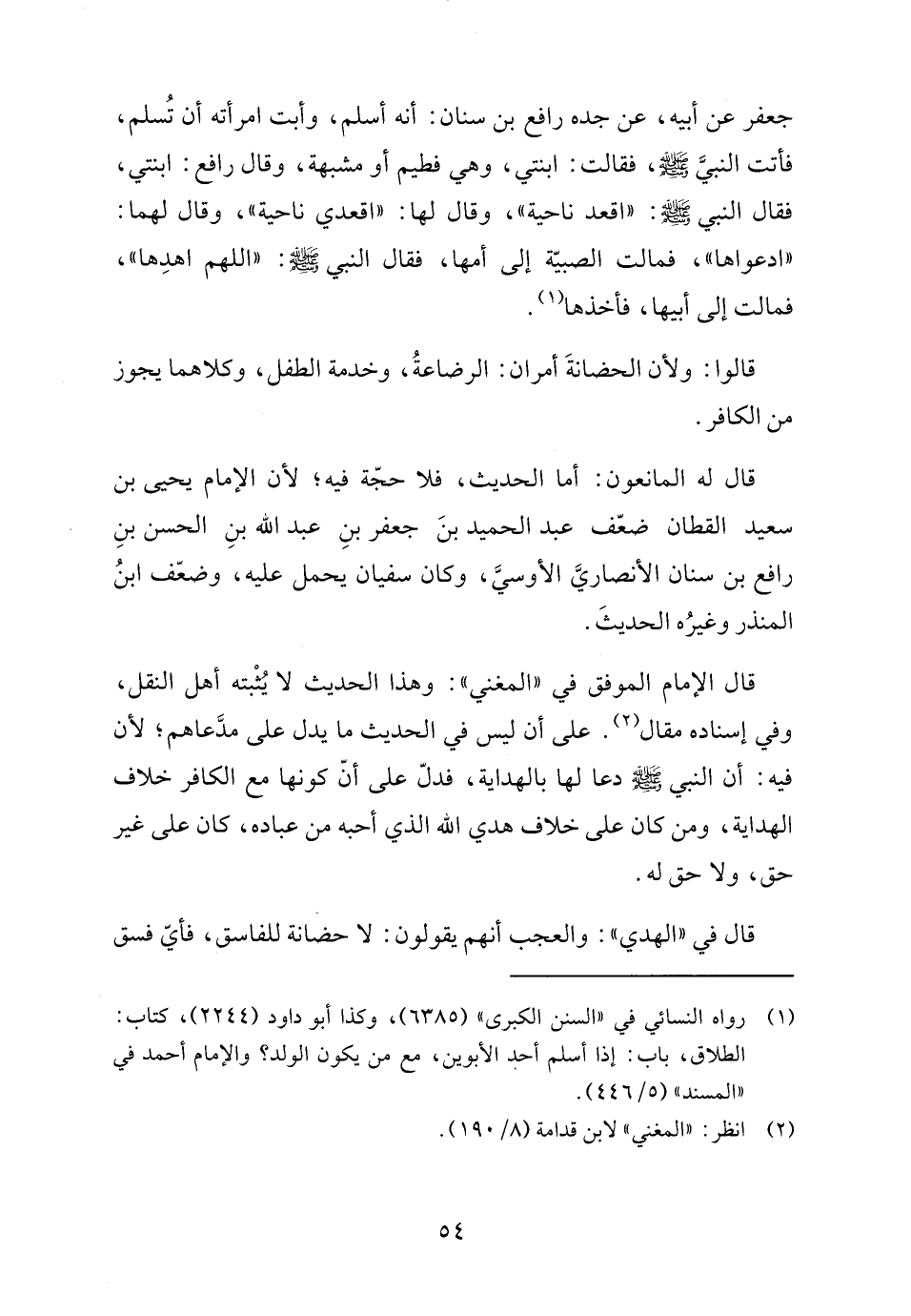 قال الإِمام الموفق في "المغني": وهذا الحديث لا يُثْبته أهل النقل، وفي إسناده مقال (٢). على أن ليس في الحديث ما يدل على مدَّعاهم؛ لأن فيه: أن النبي - صلى الله عليه وسلم - دعا لها بالهداية، فدلّ على أنّ كونها مع الكافر خلاف الهداية، ومن كان على خلاف هدي الله الذي أحبه من عباده، كان على غير حق، ولا حق له.