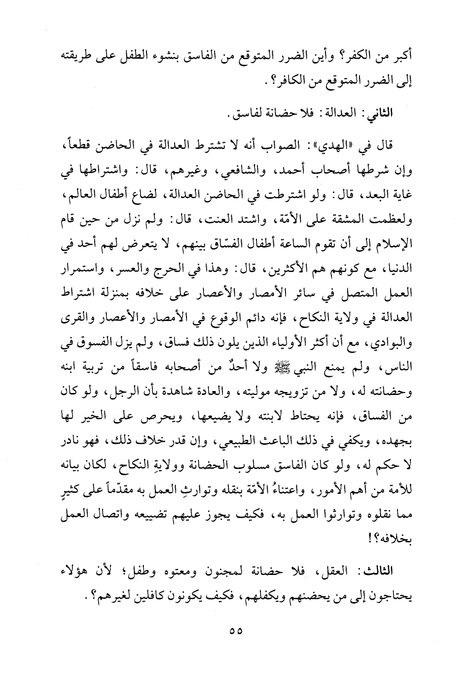 قال في "الهدي": الصواب أنه لا تشترط العدالة في الحاضن قطعًا، وإن شرطها أصحاب أحمد، والشافعي، وغيرهم، قال: واشتراطها في غاية البعد، قال: ولو اشترطت في الحاضن العدالة، لضاع أطفال العالم، ولعظمت المشقة على الأمّة، واشتد العنت، قال: ولم نزل من حين قام الإِسلام إلى أن تقوم الساعة أطفال الفسّاق بينهم، لا يتعرض لهم أحد في الدنيا، مع كونهم هم الأكثرين، قال: وهذا في الحرج والعسر، واستمرار العمل المتصل في سائر الأمصار والأعصار على خلافه بمنزلة اشتراط العدالة في ولاية النكاح، فإنه دائم الوقوع في الأمصار والأعصار والقرى والبوادي، مع أن أكثر الأولياء الذين يلون ذلك فساق، ولم يزل الفسوق في الناس، ولم يمنع النبي - صلى الله عليه وسلم - ولا أحدٌ من أصحابه فاسقًا من تربية ابنه وحضانته له، ولا من تزويجه موليته، والعادة شاهدة بأن الرجل، ولو كان من الفساق، فإنه يحتاط لابنته ولا يضيعها، ويحرص على الخير لها بجهده، ويكفي في ذلك الباعث الطبيعي، وإن قدر خلاف ذلك، فهو نادر لا حكم له، ولو كان الفاسق مسلوب الحضانة وولايةِ النكاح، لكان بيانه للأمة من أهم الأمور، واعتناءُ الأمّة بنقله وتوارثِ العمل به مقدّمًا على كثيرٍ مما نقلوه وتوارثوا العمل به، فكيف يجوز عليهم تضييعه واتصال العمل بخلافه؟!