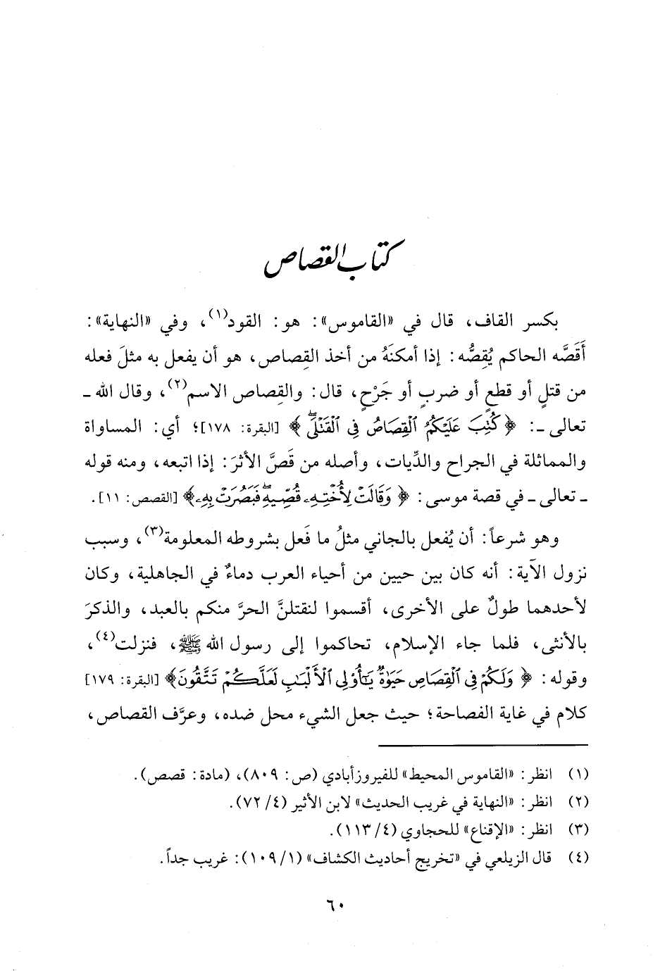 وهو شرعًا: أن يُفعل بالجاني مثلُ ما فَعل بشروطه المعلومة (٣)، وسبب نزول الآية: أنه كان بين حيين من أحياء العرب دماءٌ في الجاهلية، وكان لأحدهما طولٌ على الأخرى، أقسموا لنقتلنَّ الحرَّ منكم بالعبد، والذكرَ بالأنثى، فلما جاء الإِسلام، تحاكموا إلى رسول الله - صلى الله عليه وسلم -، فنزلت (٤)، وقوله: {وَلَكُمْ فِي الْقِصَاصِ حَيَاةٌ يَاأُولِي الْأَلْبَابِ لَعَلَّكُمْ تَتَّقُونَ} [البقرة: ١٧٩] كلام في غاية الفصاحة، حيث جعل الشيء محل ضده، وعرَّف القصاص،