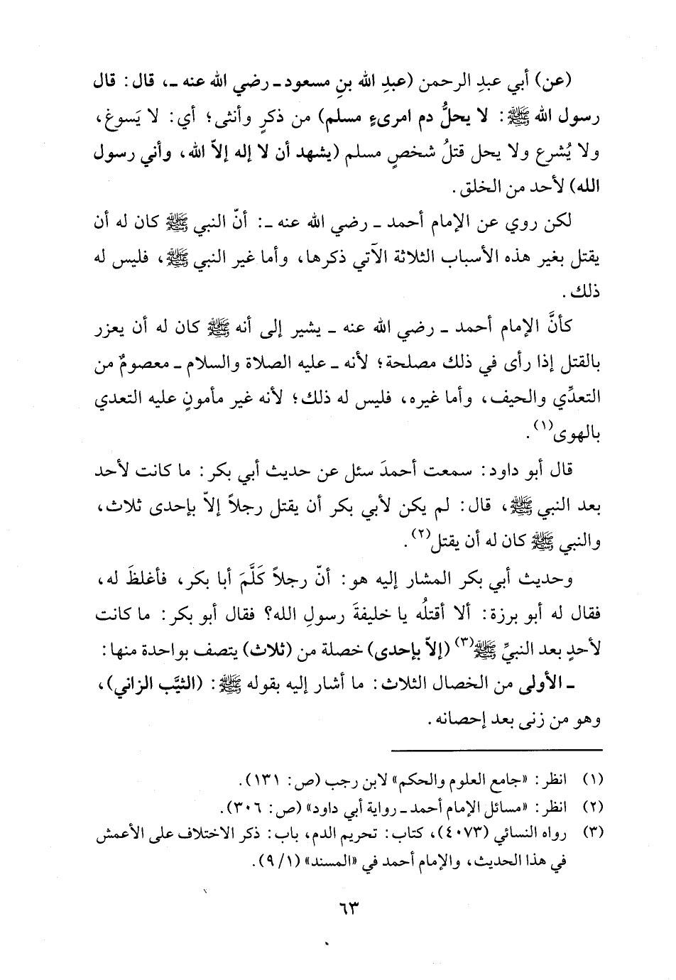 (عن) أبي عبدِ الرحمن (عبدِ الله بنِ مسعود - رضي الله عنه -، قال: قال رسول الله - صلى الله عليه وسلم -: لا يحلُّ دم امرئٍ مسلم) من ذكرٍ وأنثى؛ أي: لا يَسوغ، ولا يُشرع ولا يحل قتلُ شخصٍ مسلم (يشهد أن لا إله إلّا الله، وأني رسول الله) لأحد من الخلق.