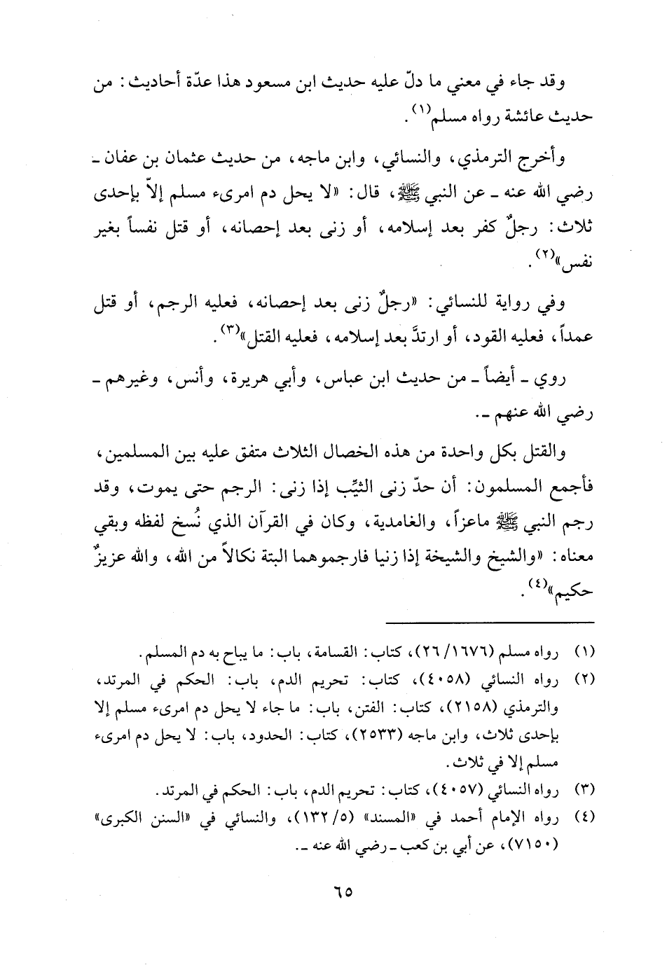 وأخرج الترمذي، والنسائي، وابن ماجه، من حديث عثمان بن عفان - رضي الله عنه - عن النبي - صلى الله عليه وسلم -، قال: "لا يحل دم امرئ مسلم إلاّ بإحدى ثلاث: رجل كفر بعد إسلامه، أو زنى بعد إحصانه، أو قتل نفسًا بغير نفس" (٢).