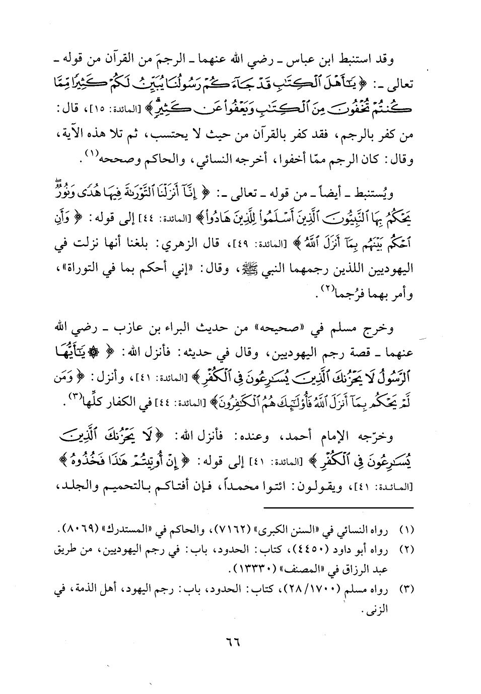 وقد استنبط ابن عباس - رضي الله عنهما - الرجمَ من القرآن من قوله -تعالى-: {يَاأَهْلَ الْكِتَابِ قَدْ جَاءَكُمْ رَسُولُنَا يُبَيِّنُ لَكُمْ كَثِيرًا مِمَّا كُنْتُمْ تُخْفُونَ مِنَ الْكِتَابِ وَيَعْفُو عَنْ كَثِيرٍ} [المائدة: ١٥] , قال: من كفر بالرجم، فقد كفر بالقرآن من حيث لا يحتسب، ثم تلا هذه الآية، وقال: كان الرجم ممّا أخفوا، أخرجه النسائي، والحاكم وصححه (١).
