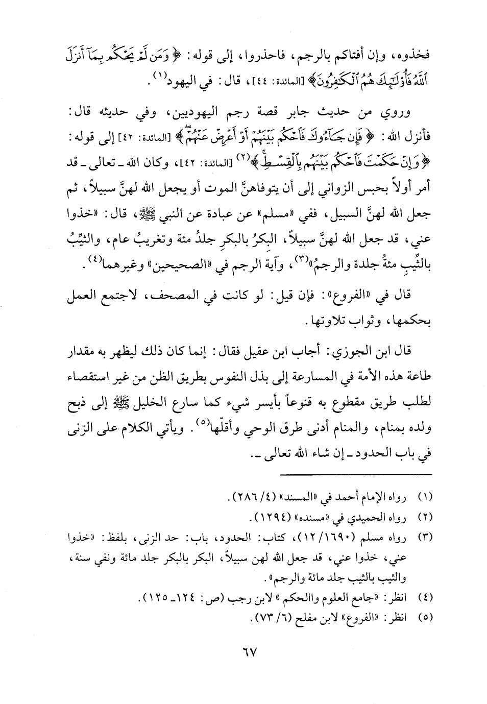 وروي من حديث جابر قصة رجم اليهوديين، وفي حديثه قال: فأنزل الله: {فَإِنْ جَاءُوكَ فَاحْكُمْ بَيْنَهُمْ أَوْ أَعْرِضْ عَنْهُمْ} [المائدة: ٤٢] إلى قوله: {وَإِنْ حَكَمْتَ فَاحْكُمْ بَيْنَهُمْ بِالْقِسْطِ} (٢) [المائدة: ٤٢] وكان الله -تعالى- قد أمر أولًا بحبس الزواني إلى أن يتوفاهنَّ الموت أو يجعل الله لهنَّ سبيلًا، ثم جعل الله لهنَّ السبيل، ففي "مسلم" عن عبادة عن النبي - صلى الله عليه وسلم -، قال: "خذوا عني، قد جعل الله لهنَّ سبيلًا، البِكرُ بالبكرِ جلدُ مئة وتغريبُ عام، والثيِّبُ بالثِّيبِ مئةُ جلدة والرجمُ" (٣)، وآية الرجم في "الصحيحين" وغيرهما (٤).