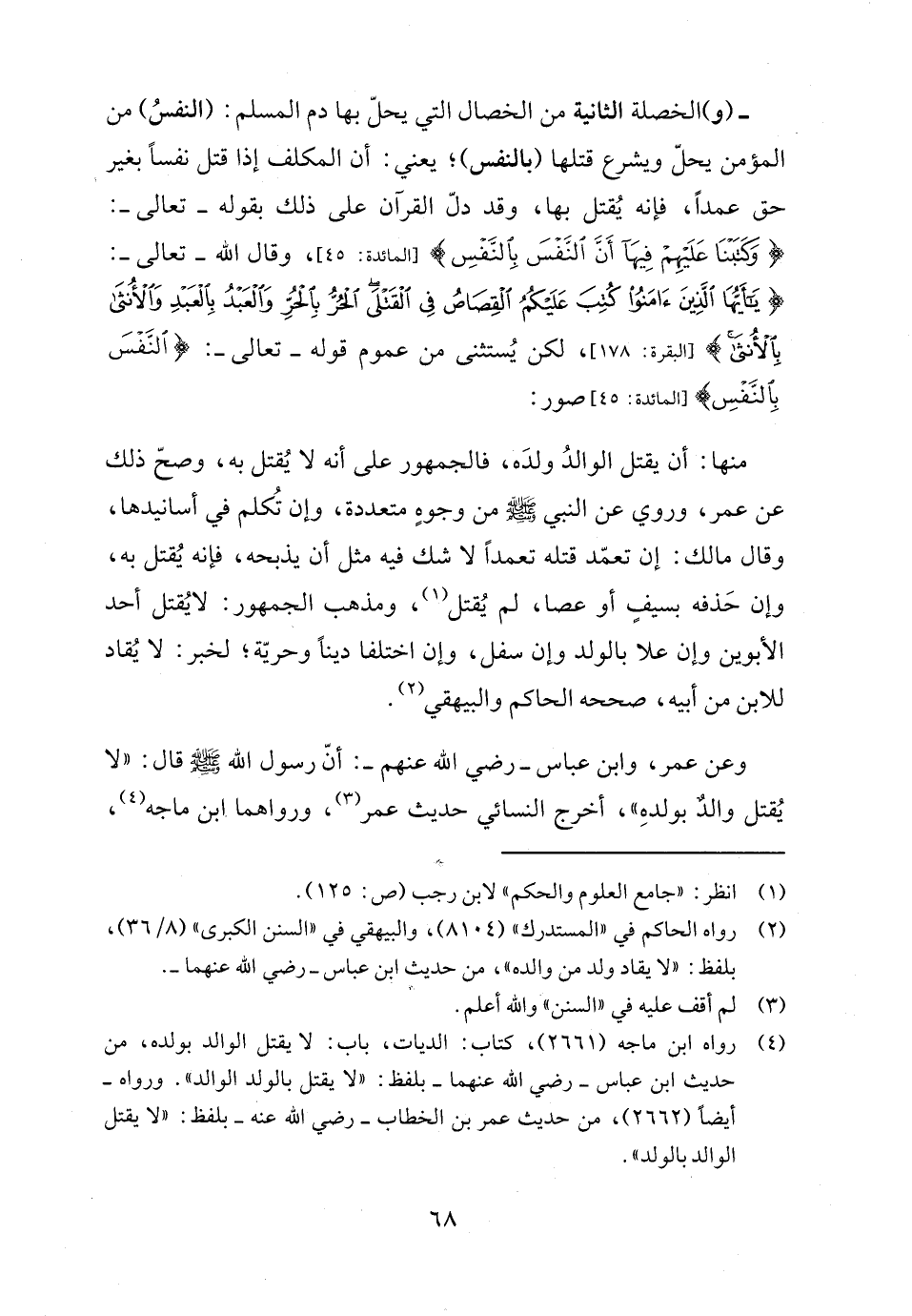 (٤) رواه ابن ماجه (٢٦٦١)، كتاب: الديات، باب: لا يقتل الوالد بولده، من حديث ابن عباس - رضي الله عنهما - بلفظ: "لا يقتل بالولد الوالد". ورواه -أيضًا- (٢٦٦٢)، من حديث عمر بن الخطاب - رضي الله عنه - بلفظ: "لا يقتل الوالد بالولد".