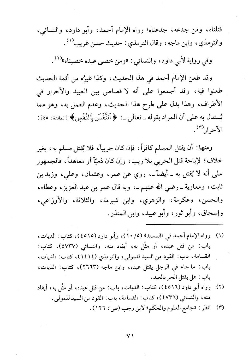 (١) رواه الإِمام أحمد في "المسند" (٥/ ١٠)، وأبو داود (٤٥١٥)، كتاب: الديات، باب: من قتل عبده، أو مثَّل به، أيقاد منه، والنسائي (٤٧٣٧)، كتاب: القسامة، باب: القود من السيد للمولى، والترمذي (١٤١٤)، كتاب: الديات، باب: ما جاء في الرجل يقتل عبده، وابن ماجه (٢٦٦٣)، كتاب: الديات، باب: هل يقتل الحر بالعبد.