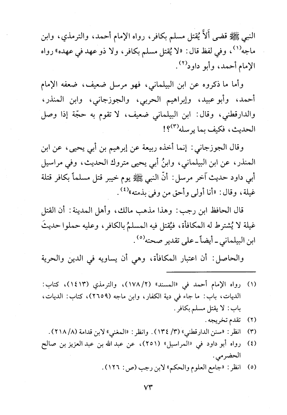 وقال الجوزجاني: إنما أخذه ربيعة عن إبرهيم بن أبي يحيى، عن ابن المنذر، عن ابن البيلماني، وابنُ أبي يحيى متروك الحديث، وفي مراسيل أبي داود حديث آخر مرسل: أنّ النبي - صلى الله عليه وسلم - يوم خيبر قتل مسلمًا بكافر قتلة غيلة، وقال: "أنا أولى وأحق من وفي بذمته" (٤).