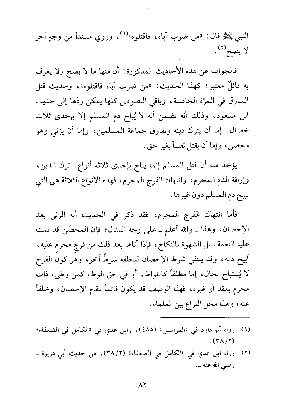 فالجواب عن هذه الأحاديث المذكورة: أن منها ما لا يصح ولا يعرف به قائل معتبر، كهذا الحديث: "من ضرب أباه فاقتلوه"، وحديث قتل السارق في المرّة الخامسة، وباقي النصوص كلها يمكن ردّها إلى حديث ابن مسعود، وذلك أنه تضمن أنه لا يُباح دم المسلم إلا بإحدى ثلاث خصال: إما أن يترك دينه ويفارق جماعة المسلمين، وإما أن يزني وهو محصن، وإما أن يقتل نفسًا بغير حق.