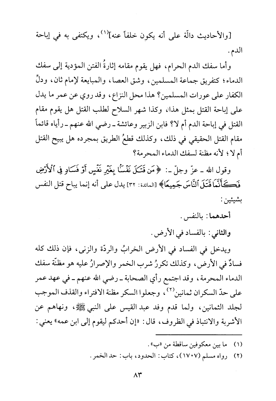 ويدخل في الفساد في الأرض الخرابُ والردّة والزنى، فإن ذلك كله فسادٌ في الأرض، وكذلك تكررُ شرب الخمر والإصرارُ عليه هو مظنّة سفك الدماء المحرمة، وقد اجتمع رأي الصحابة - رضي الله عنهم - في عهد عمر على حدّ السكران ثمانين (٢)، وجعلوا السكر مظنة الافتراء والقذف الموجب لجلد الثمانين، ولما قدم وفد عبد القيس على النبي - صلى الله عليه وسلم -، ونهاهم عن الأشربة والانتباذ في الظروف، قال: "إن أحدكم ليقوم إلى ابن عمه" يعني: