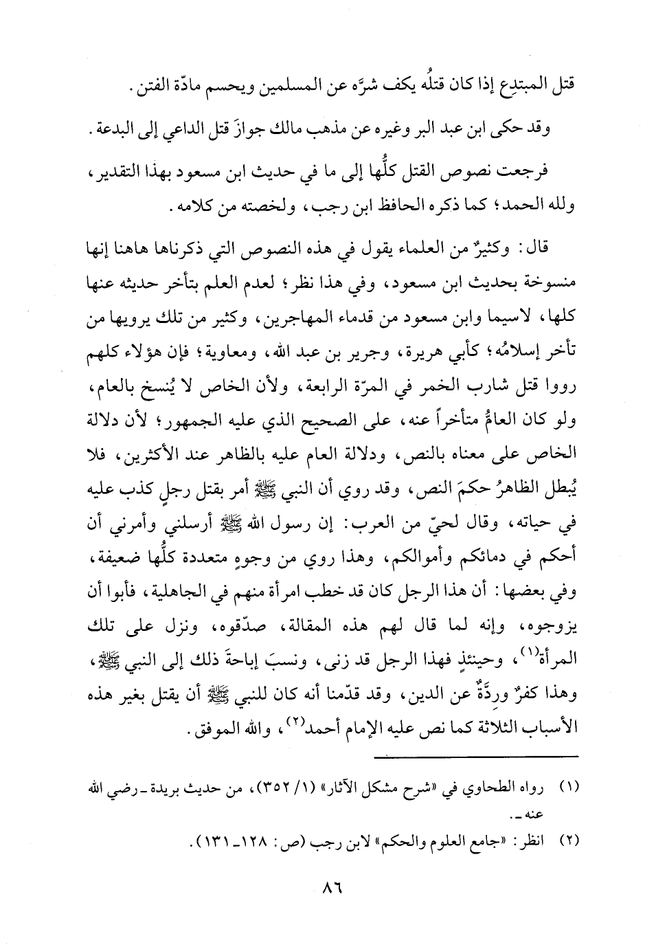 فرجعت نصوص القتل كلُّها إلى ما في حديث ابن مسعود بهذا التقدير، ولله الحمد، كما ذكره الحافظ ابن رجب، ولخصته من كلامه.