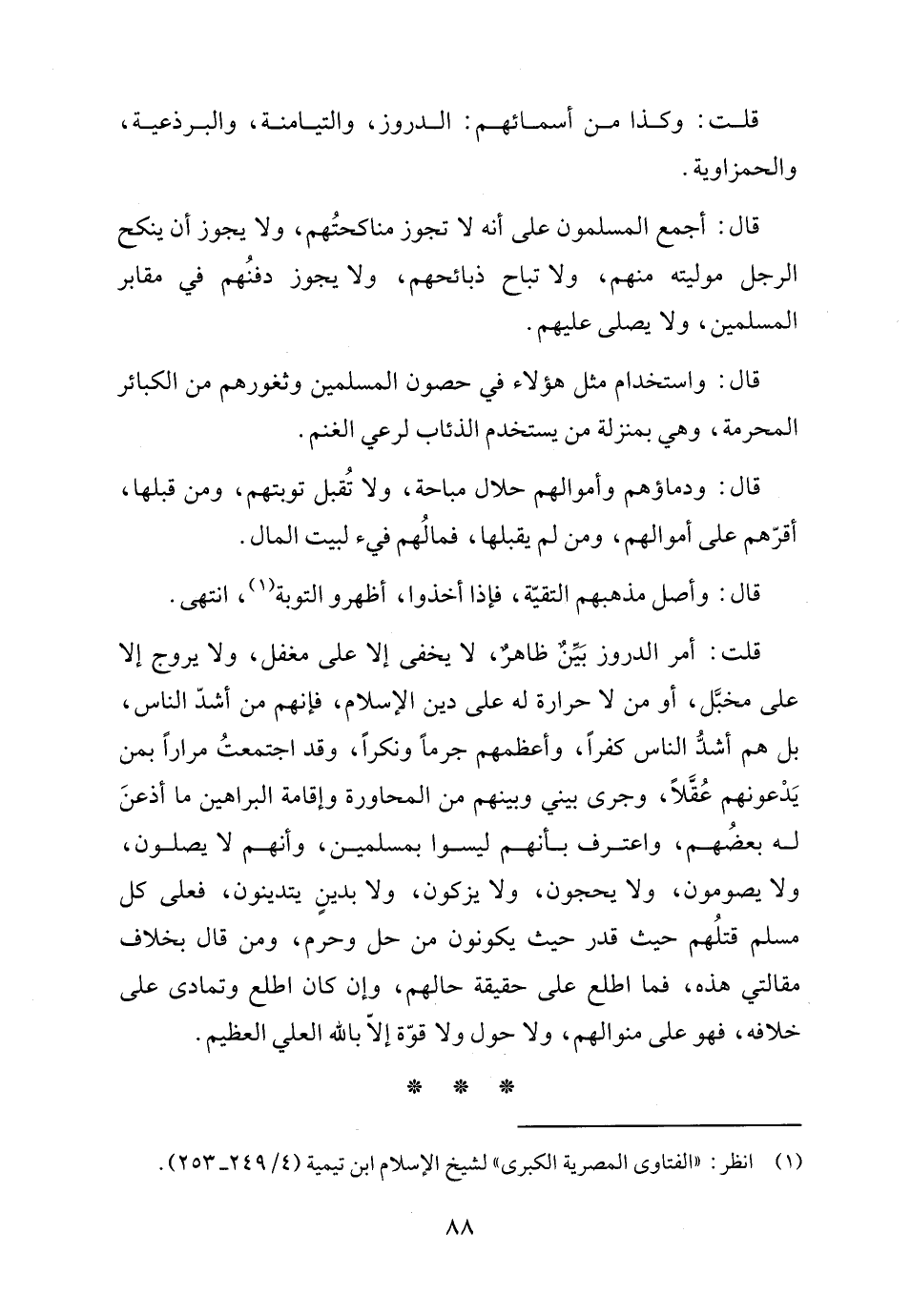 قلت: أمر الدروز بَيِّنٌ ظاهرٌ، لا يخفى إلا على مغفل، ولا يروج إلا على مخبَّل، أو من لا حرارة له على دين الإِسلام، فإنهم من أشدّ الناس، بل هم أشدُّ الناس كفرًا، وأعظمهم جرمًا ونكرًا، وقد اجتمعتُ مرارًا بمن يَدْعونهم عُقَّلًا، وجرى بيني وبينهم من المحاورة وإقامة البراهين ما أذعنَ له بعضُهم، واعترف بأنهم ليسوا بمسلمين، وأنهم لا يصلون، ولا يصومون، ولا يحجون، ولا يزكون، ولا بدينٍ يتدينون، فعلى كل مسلم قتلُهم حيث قدر حيث يكونون من حل وحرم، ومن قال بخلاف مقالتي هذه، فما اطلع على حقيقة حالهم، وإن كان اطلع وتمادى على خلافه، فهو على منوالهم، ولا حول ولا قوّة إلاّ بالله العلي العظيم.