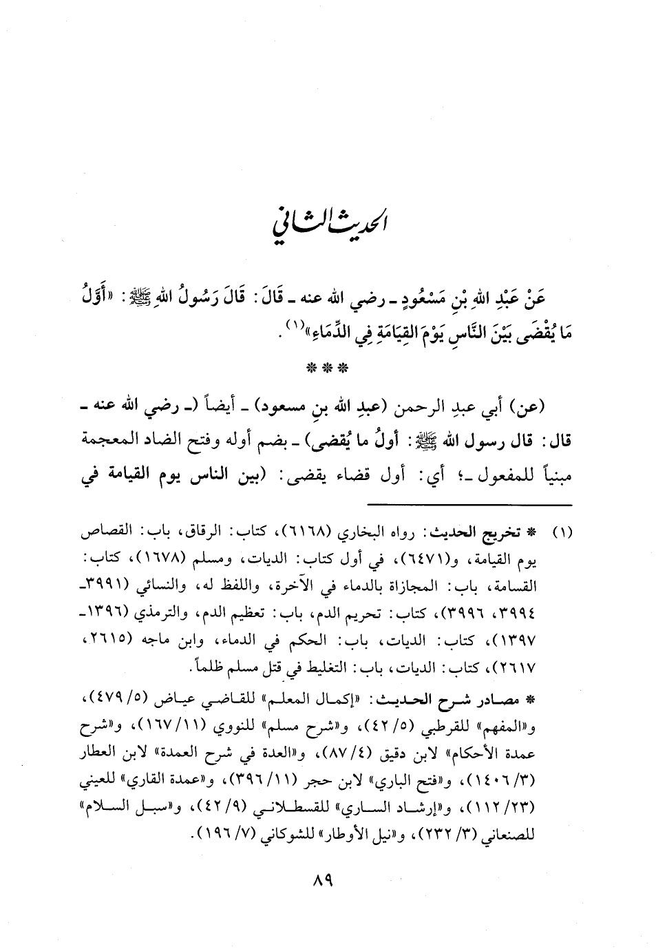 عَنْ عَبْدِ اللهِ بْنِ مَسْعُودٍ - رضي الله عنه - قَالَ: قَالَ رَسُولُ اللهِ - صلى الله عليه وسلم -: "أَوَّلُ مَا يُقْضَى بَيْنَ النَّاسِ يَوْمَ القِيَامَةِ في الدِّمَاءِ" (١).