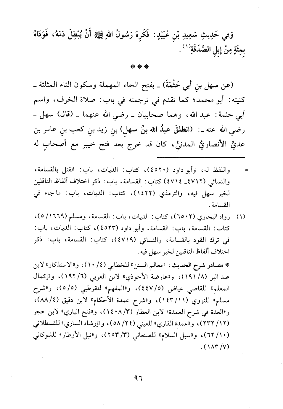 وَفي حَدِيثِ سَعِيدِ بْنِ عُبَيْدٍ: فَكَرِهَ رَسُولُ الله - صلى الله عليه وسلم - أَنْ يُبْطِلَ دَمَهُ، فَوَدَاهُ بِمِئَةٍ مِنْ إِبِلِ الصَّدَقَةِ (١).