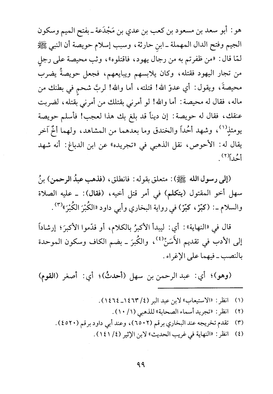(إلى رسول الله - صلى الله عليه وسلم -): متعلق بقوله: فانطلق، (فذهب عبدُ الرحمن) بنُ سهل أخو المقتول (يتكلم) في أمر قتل أخيه، (فقال): -عليه الصلاة والسلام-: (كبّرْ، كبّرْ) في رواية البخاري وأبي داود "الكُبْرَ الكُبْرَ" (٣).