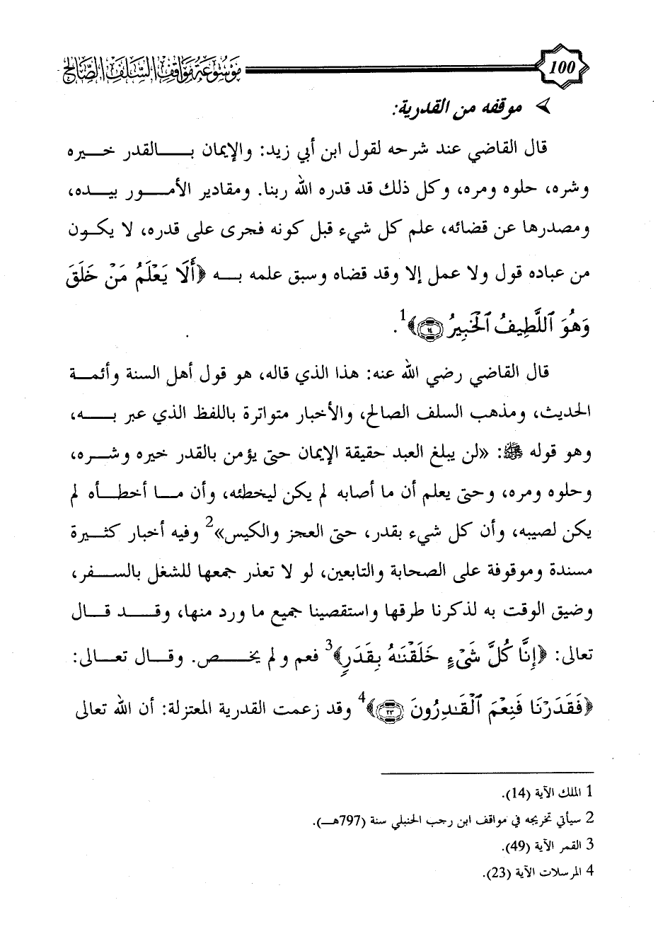 قال القاضي عند شرحه لقول ابن أبي زيد: والإيمان بالقدر خيره وشره، حلوه ومره، وكل ذلك قد قدره الله ربنا. ومقادير الأمور بيده، ومصدرها عن قضائه، علم كل شيء قبل كونه فجرى على قدره، لا يكون من عباده قول ولا عمل إلا وقد قضاه وسبق علمه به {أَلَا يَعْلَمُ مَنْ خَلَقَ وَهُوَ اللَّطِيفُ الْخَبِيرُ (14)} (¬1).