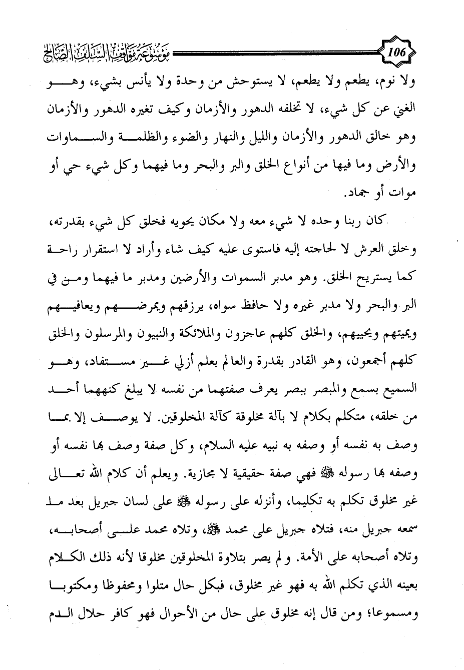 كان ربنا وحده لا شيء معه ولا مكان يحويه فخلق كل شيء بقدرته، وخلق العرش لا لحاجته إليه فاستوى عليه كيف شاء وأراد لا استقرار راحة كما يستريح الخلق. وهو مدبر السموات والأرضين ومدبر ما فيهما ومن في البر والبحر ولا مدبر غيره ولا حافظ سواه، يرزقهم ويمرضهم ويعافيهم ويميتهم ويحييهم، والخلق كلهم عاجزون والملائكة والنبيون والمرسلون والخلق كلهم أجمعون، وهو القادر بقدرة والعالم بعلم أزلي غير مستفاد، وهو السميع بسمع والمبصر ببصر يعرف صفتهما من نفسه لا يبلغ كنههما أحد من خلقه، متكلم بكلام لا بآلة مخلوقة كآلة المخلوقين. لا يوصف إلا بما وصف به نفسه أو وصفه به نبيه عليه السلام، وكل صفة وصف بها نفسه أو وصفه بها رسوله - صلى الله عليه وسلم - فهي صفة حقيقية لا مجازية. ويعلم أن كلام الله تعالى غير مخلوق تكلم به تكليما، وأنزله على رسوله - صلى الله عليه وسلم - على لسان جبريل بعد ما سمعه جبريل منه، فتلاه جبريل على محمد - صلى الله عليه وسلم -، وتلاه محمد على أصحابه، وتلاه أصحابه على الأمة. ولم يصر بتلاوة المخلوقين مخلوقا لأنه ذلك الكلام بعينه الذي تكلم الله به فهو غير مخلوق، فبكل حال متلوا ومحفوظا ومكتوبا ومسموعا؛ ومن قال إنه مخلوق على حال من الأحوال فهو كافر حلال الدم