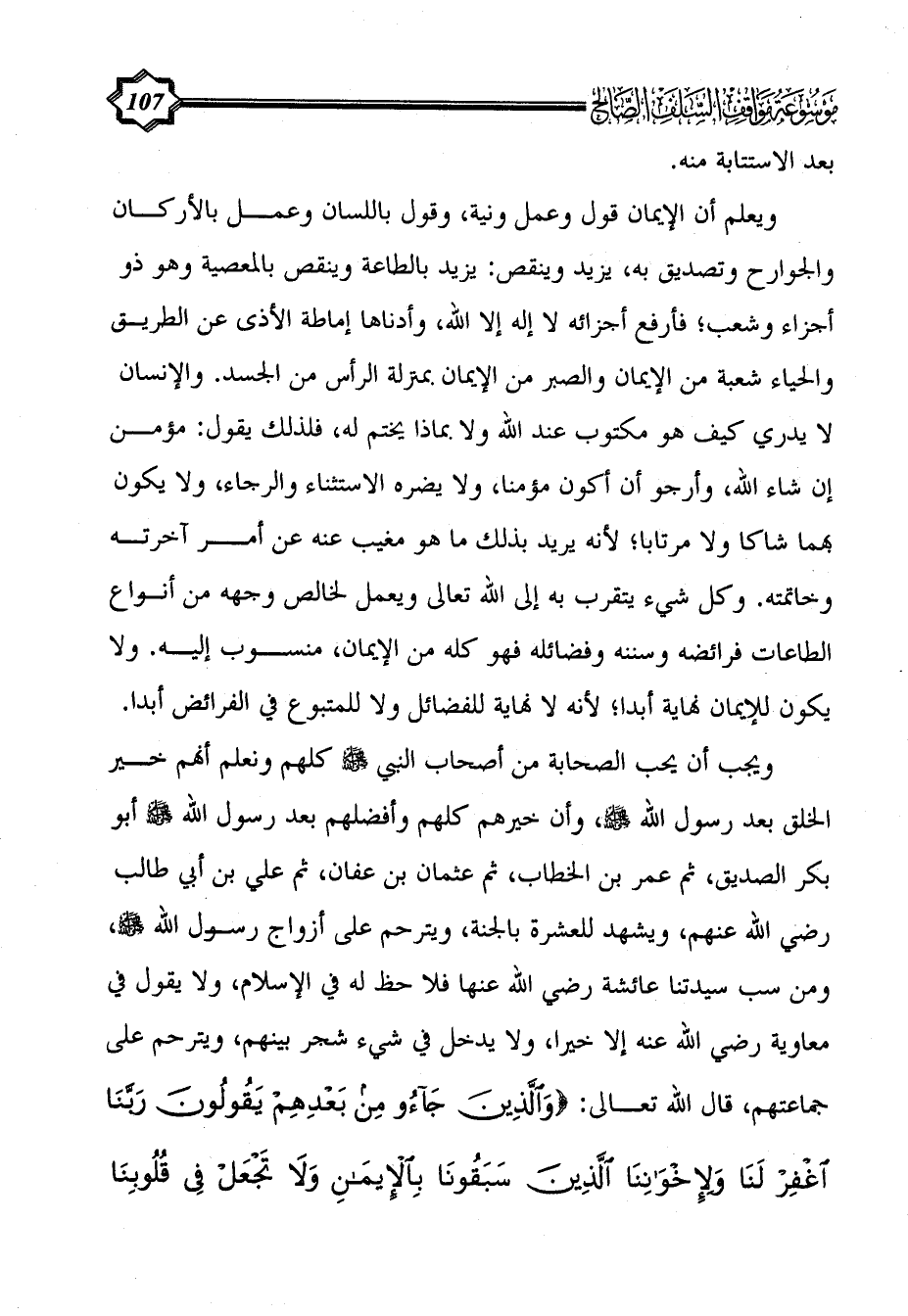 ويجب أن يحب الصحابة من أصحاب النبي - صلى الله عليه وسلم - كلهم ونعلم أنهم خير الخلق بعد رسول الله - صلى الله عليه وسلم -، وأن خيرهم كلهم وأفضلهم بعد رسول الله - صلى الله عليه وسلم - أبو بكر الصديق، ثم عمر بن الخطاب، ثم عثمان بن عفان، ثم علي بن أبي طالب رضي الله عنهم، ويشهد للعشرة بالجنة، ويترحم على أزواج رسول الله - صلى الله عليه وسلم -، ومن سب سيدتنا عائشة رضي الله عنها فلا حظ له في الإسلام، ولا يقول في معاوية رضي الله عنه إلا خيرا، ولا يدخل في شيء شجر بينهم، ويترحم على جماعتهم، قال الله تعالى: {وَالَّذِينَ جَاءُوا مِنْ بَعْدِهِمْ يَقُولُونَ رَبَّنَا اغْفِرْ لَنَا وَلِإِخْوَانِنَا الَّذِينَ سَبَقُونَا بِالْإِيمَانِ وَلَا تَجْعَلْ فِي قُلُوبِنَا