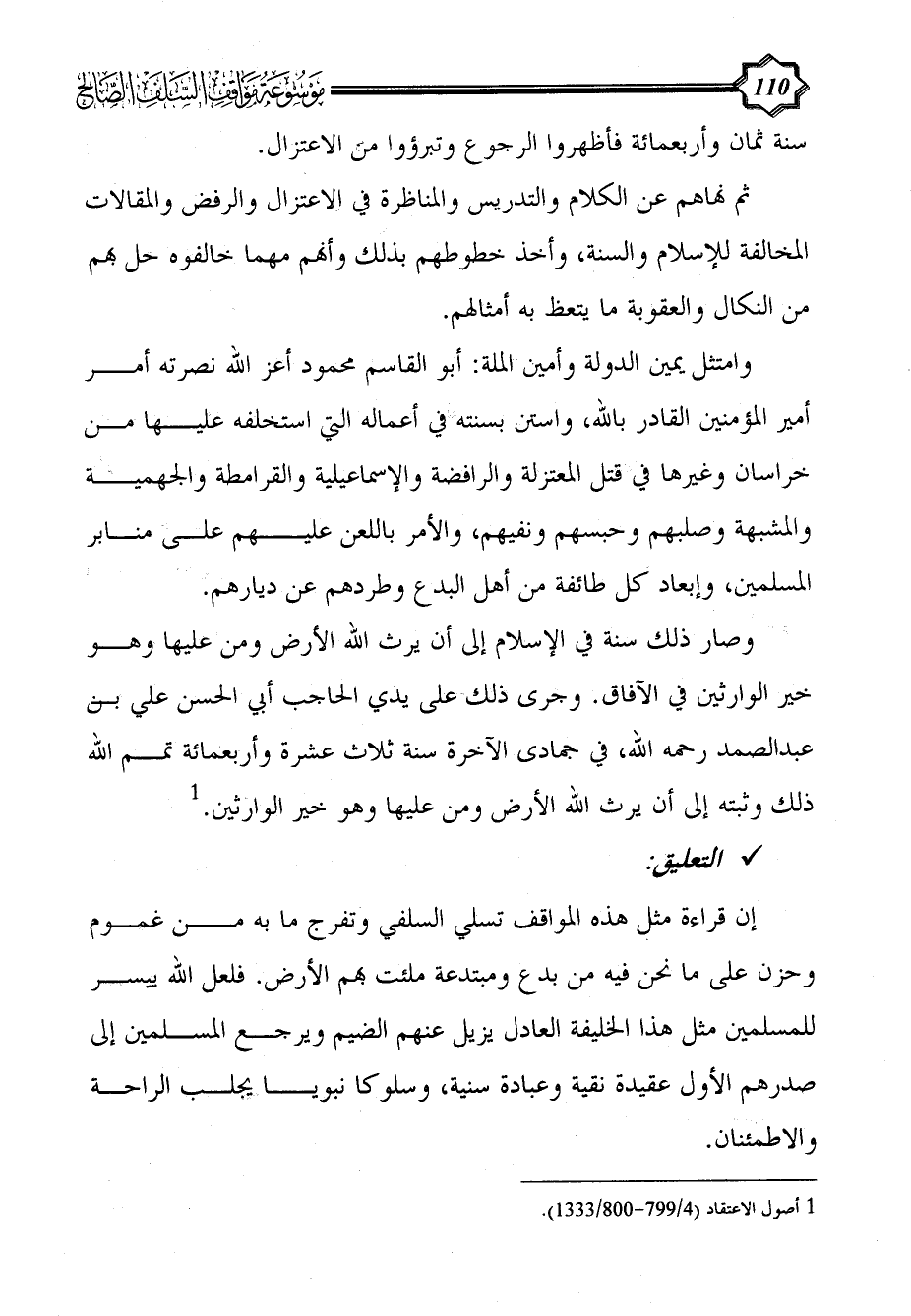 إن قراءة مثل هذه المواقف تسلي السلفي وتفرج ما به من غموم وحزن على ما نحن فيه من بدع ومبتدعة ملئت بهم الأرض. فلعل الله ييسر للمسلمين مثل هذا الخليفة العادل يزيل عنهم الضيم ويرجع المسلمين إلى صدرهم الأول عقيدة نقية وعبادة سنية، وسلوكا نبويا يجلب الراحة والاطمئنان.
