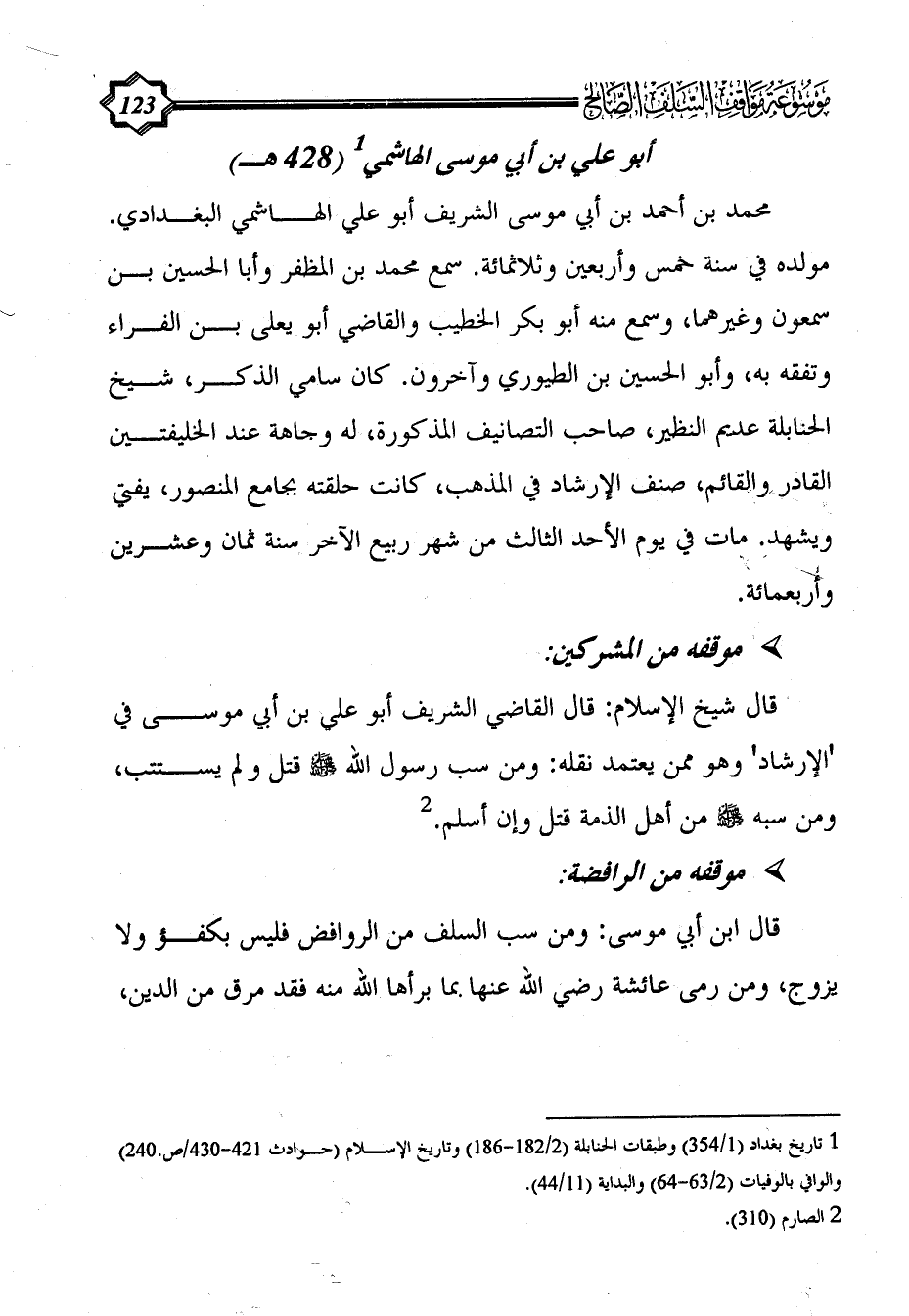 قال شيخ الإسلام: قال القاضي الشريف أبو علي بن أبي موسى في 'الإرشاد' وهو ممن يعتمد نقله: ومن سب رسول الله - صلى الله عليه وسلم - قتل ولم يستتب، ومن سبه - صلى الله عليه وسلم - من أهل الذمة قتل وإن أسلم. (¬2)
