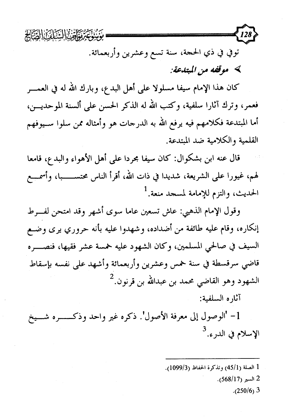 وقول الإمام الذهبي: عاش تسعين عاما سوى أشهر وقد امتحن لفرط إنكاره، وقام عليه طائفة من أضداده، وشهدوا عليه بأنه حروري يرى وضع السيف في صالحي المسلمين، وكان الشهود عليه خمسة عشر فقيها، فنصره قاضي سرقسطة في سنة خمس وعشرين وأربعمائة وأشهد على نفسه بإسقاط الشهود وهو القاضي محمد بن عبد الله بن قرنون. (¬2)