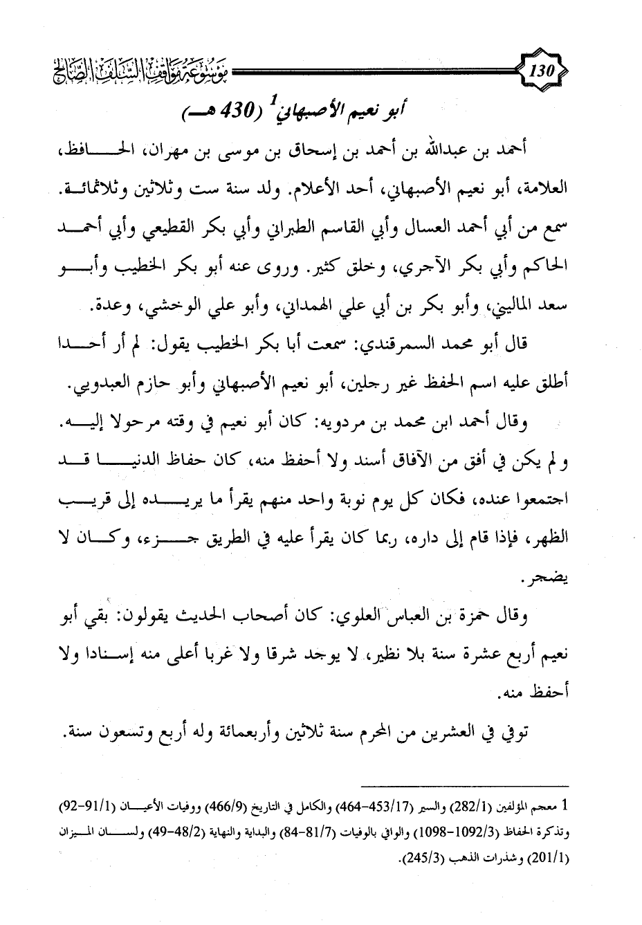 أحمد بن عبد الله بن أحمد بن إسحاق بن موسى بن مهران، الحافظ، العلامة، أبو نعيم الأصبهاني، أحد الأعلام. ولد سنة ست وثلاثين وثلاثمائة. سمع من أبي أحمد العسال وأبي القاسم الطبراني وأبي بكر القطيعي وأبي أحمد الحاكم وأبي بكر الآجري، وخلق كثير. وروى عنه أبو بكر الخطيب وأبو سعد الماليني، وأبو بكر بن أبي علي الهمداني، وأبو علي الوخشي، وعدة.