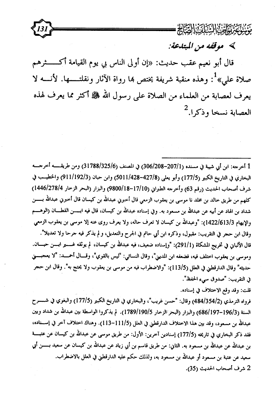 (¬1) أخرجه: ابن أبي شيبة في مسنده (1/ 207 - 208/ 306) في المصنف (6/ 325/31788) ومن طريقه أخرجه البخاري في التاريخ الكبير (5/ 177) وأبو يعلى (8/ 427 - 428/ 5011) وابن حبان (3/ 192/911) والخطيب في شرف أصحاب الحديث (رقم 63) وأخرجه الطبراني (10/ 17 - 18/ 9800) والبزار (البحر الزخار 4/ 278/1446) كلهم من طريق خالد بن مخلد نا موسى بن يعقوب الزمعي قال أخبرني عبد الله بن كيسان قال أخبرني عبد الله بن شداد بن الهاد عن أبيه عن عبد الله بن مسعود به. وفي إسناده عبد الله بن كيسان، قال فيه ابن القطان (الوهم والإيهام 3/ 613/1422): "وعبد الله بن كيسان لا تعرف حاله، ولا يعرف روى عنه إلا موسى بن يعقوب الزمعي وقال ابن حجر في التقريب: مقبول، وذكره ابن أبي حاتم في الجرح والتعديل، ولم يذكر فيه جرحا ولا تعديلا".