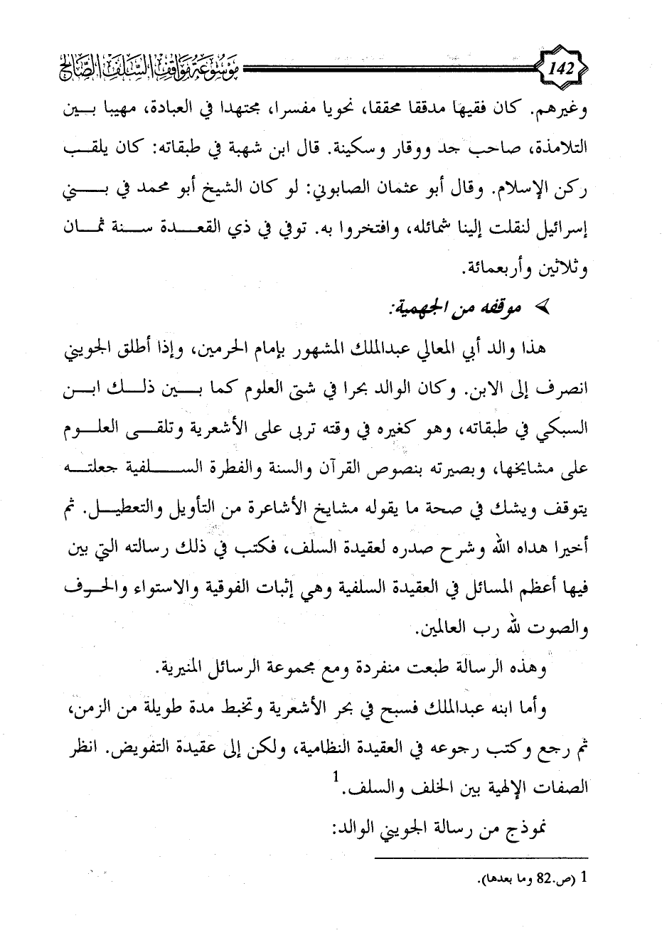 هذا والد أبي المعالي عبد الملك المشهور بإمام الحرمين، وإذا أطلق الجويني انصرف إلى الابن. وكان الوالد بحرا في شتى العلوم كما بين ذلك ابن السبكي في طبقاته، وهو كغيره في وقته تربى على الأشعرية وتلقى العلوم على مشايخها، وبصيرته بنصوص القرآن والسنة والفطرة السلفية جعلته يتوقف ويشك في صحة ما يقوله مشايخ الأشاعرة من التأويل والتعطيل. ثم أخيرا هداه الله وشرح صدره لعقيدة السلف، فكتب في ذلك رسالته التي بين فيها أعظم المسائل في العقيدة السلفية وهي إثبات الفوقية والاستواء والحرف والصوت لله رب العالمين.