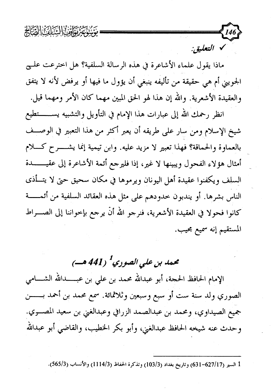انظر رحمك الله إلى عبارات هذا الإمام في التأويل والتشبيه يستطيع شيخ الإسلام ومن سار على طريقه أن يعبر أكثر من هذا التعبير في الوصف بالعماوة والحماقة؟ فهذا تعبير لا مزيد عليه. وابن تيمية إنما يشرح كلام أمثال هؤلاء الفحول ويبينها لا غير، إذا فليرجع أئمة الأشاعرة إلى عقيدة السلف ويكفنوا عقيدة أهل اليونان ويرموها في مكان سحيق حتى لا يتأذى الناس بشرها. أو يندبون خدودهم على مثل هذه العقائد السلفية من أئمة كانوا فحولا في العقيدة الأشعرية، فنرجو الله أن يرجع بإخواننا إلى الصراط المستقيم إنه سميع مجيب.