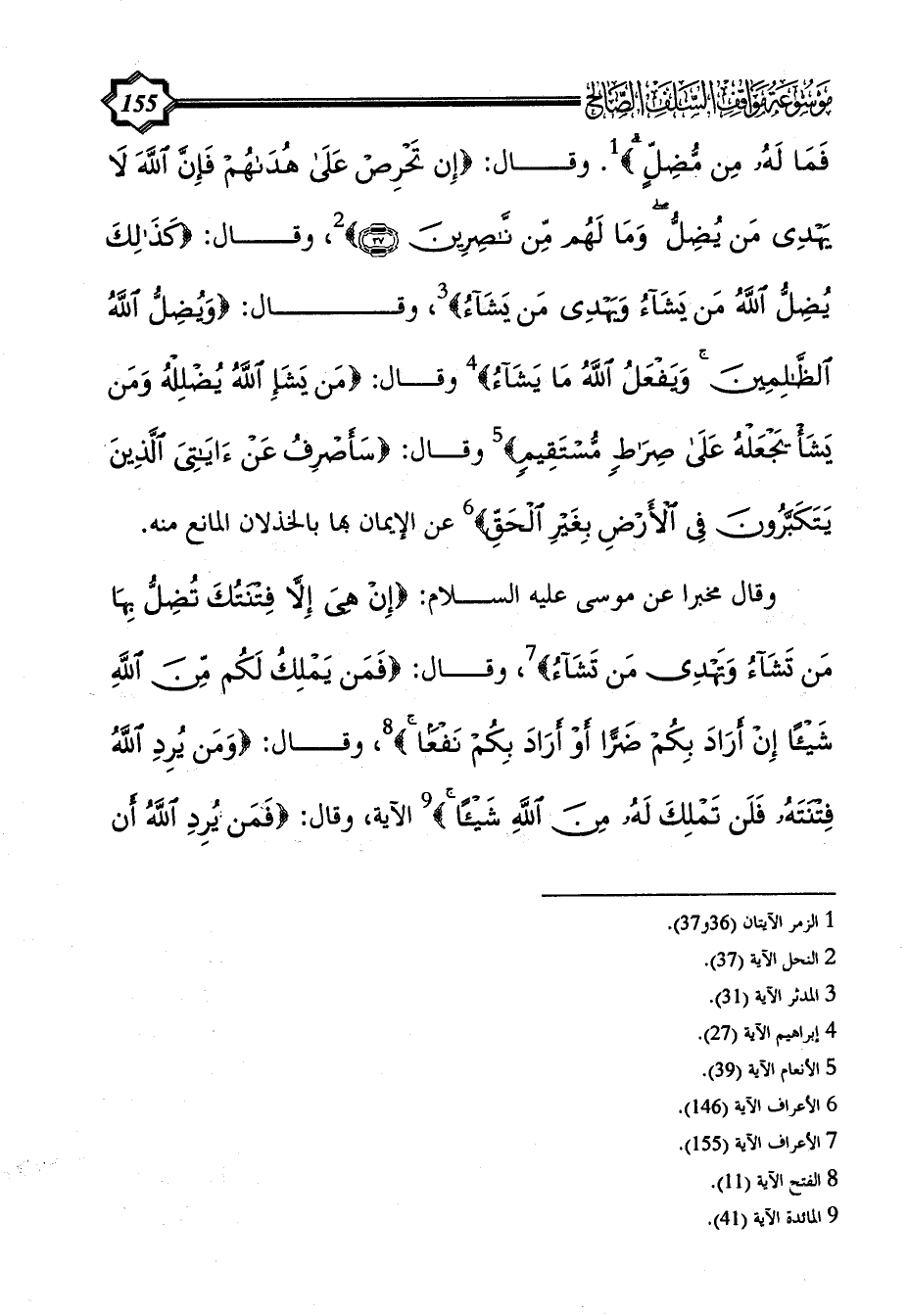 فَمَا لَهُ مِنْ مُضِلٍّ} (¬1). وقال: {إِنْ تَحْرِصْ عَلَى هُدَاهُمْ فَإِنَّ اللَّهَ لَا يَهْدِي مَنْ يُضِلُّ وَمَا لَهُمْ مِنْ نَاصِرِينَ (37)} (¬2)، وقال: {كَذَلِكَ يُضِلُّ اللَّهُ مَنْ يَشَاءُ وَيَهْدِي مَنْ يَشَاءُ} (¬3)، وقال: {وَيُضِلُّ اللَّهُ الظَّالِمِينَ وَيَفْعَلُ اللَّهُ مَا يَشَاءُ} (¬4) وقال: {مَنْ يَشَأِ اللَّهُ يُضْلِلْهُ وَمَنْ يَشَأْ يَجْعَلْهُ عَلَى صِرَاطٍ مُسْتَقِيمٍ} (¬5) وقال: {سَأَصْرِفُ عَنْ آَيَاتِيَ الَّذِينَ يتكبرون فِي الْأَرْضِ بِغَيْرِ الْحَقِّ} (¬6) عن الإيمان بها بالخذلان المانع منه.