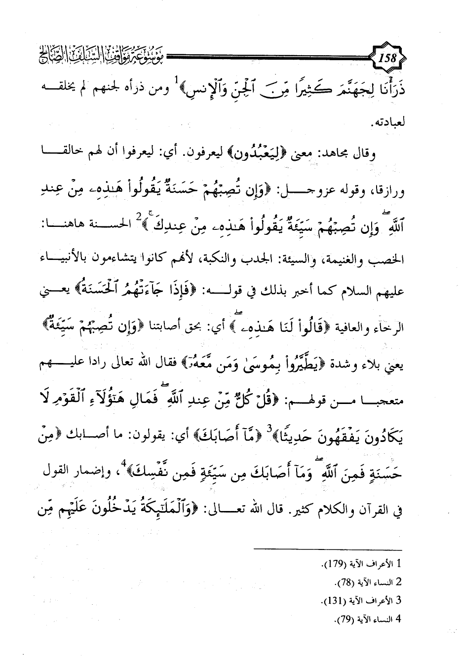 وقال مجاهد: معنى {ليعبدون} ليعرفون. أي: ليعرفوا أن لهم خالقا ورازقا، وقوله عزوجل: {وَإِنْ تُصِبْهُمْ حَسَنَةٌ يَقُولُوا هَذِهِ مِنْ عِنْدِ اللَّهِ وَإِنْ تُصِبْهُمْ سَيِّئَةٌ يَقُولُوا هَذِهِ مِنْ عِنْدِكَ} (¬2) الحسنة هاهنا: الخصب والغنيمة، والسيئة: الجدب والنكبة، لأنهم كانوا يتشاءمون بالأنبياء عليهم السلام كما أخبر بذلك في قوله: {فَإِذَا جَاءَتْهُمُ الْحَسَنَةُ} يعني الرخاء والعافية {قَالُوا لَنَا هَذِهِ} أي: بحق أصابتنا {وَإِنْ تُصِبْهُمْ سَيِّئَةٌ} يعني بلاء وشدة {يَطَّيَّرُوا بِمُوسَى وَمَنْ مَعَهُ} فقال الله تعالى رادا عليهم متعجبا من قولهم: {قُلْ كُلٌّ مِنْ عِنْدِ اللَّهِ فَمَالِ هَؤُلَاءِ الْقَوْمِ لَا يَكَادُونَ يَفْقَهُونَ حَدِيثًا} (¬3) {مَا أَصَابَكَ} أي: يقولون: ما أصابك {مِنْ حَسَنَةٍ فَمِنَ اللَّهِ وَمَا أَصَابَكَ مِنْ سَيِّئَةٍ فَمِنْ نَفْسِكَ} (¬4)، وإضمار القول في القرآن والكلام كثير. قال الله تعالى: {وَالْمَلَائِكَةُ يَدْخُلُونَ عَلَيْهِمْ مِنْ
