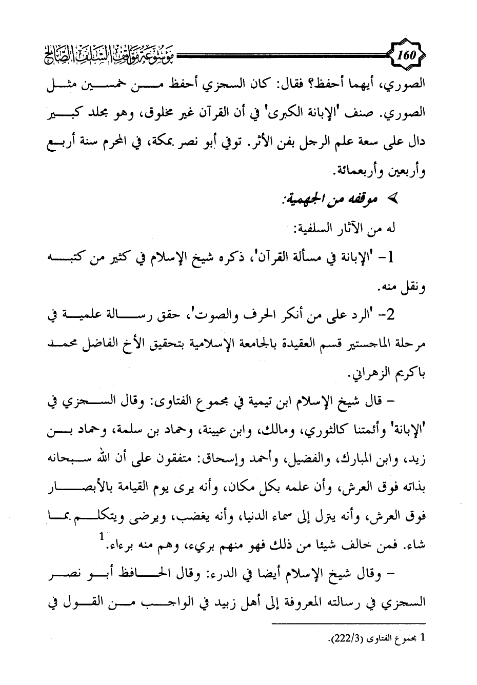 - وقال شيخ الإسلام أيضا في الدرء: وقال الحافظ أبو نصر السجزي في رسالته المعروفة إلى أهل زبيد في الواجب من القول في